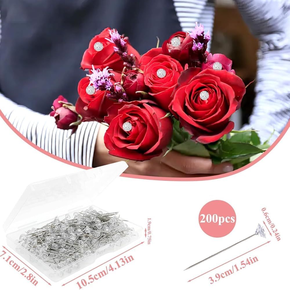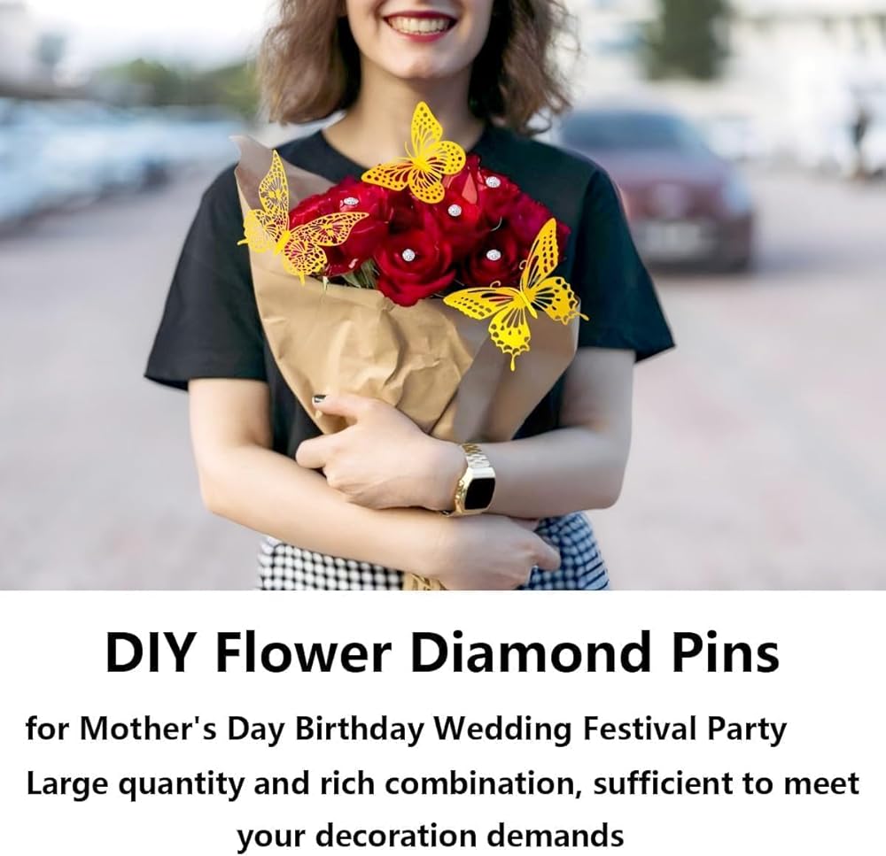 مجموعة 248 قطعة من دبابيس باقة الزهور، تتضمن 200 قطعة من دبابيس باقة الماس و48 قطعة 4 أنماط من ملصقات الفراشة الذهبية لعيد الأم وحفلات الزفاف وعيد الحب