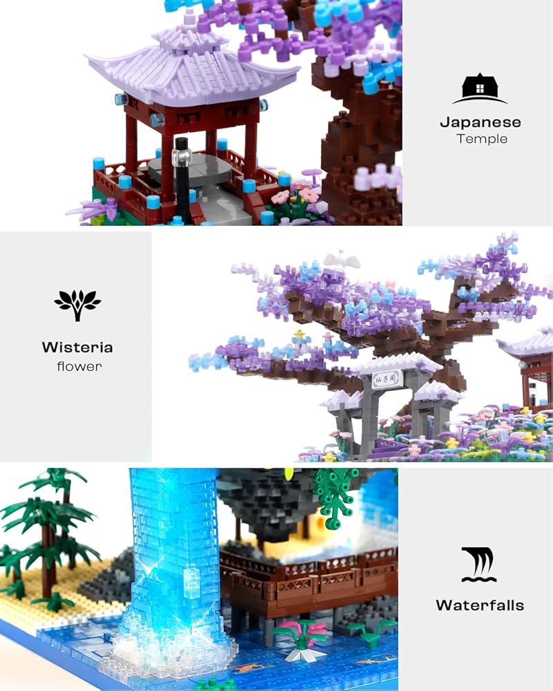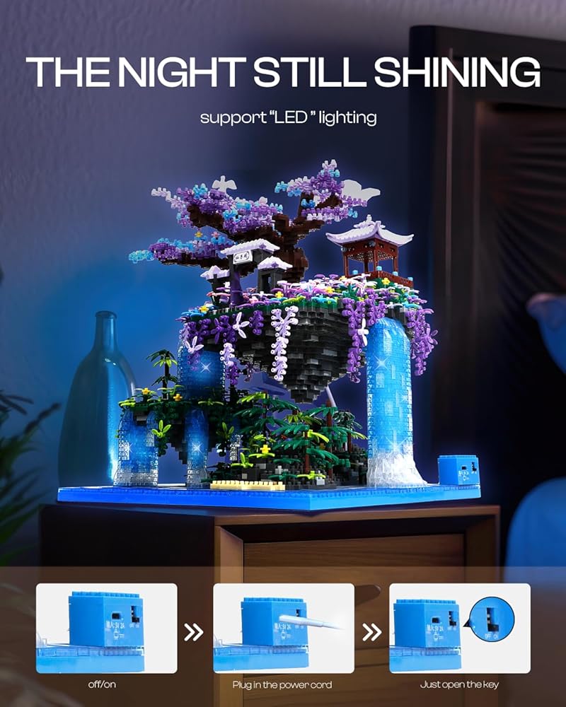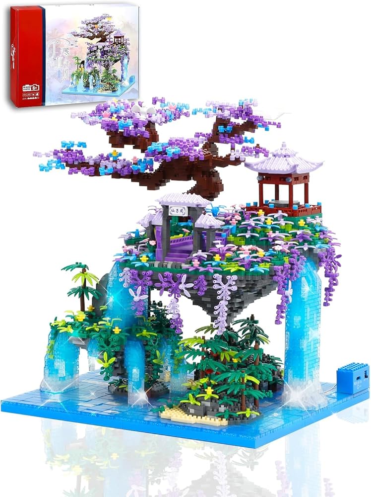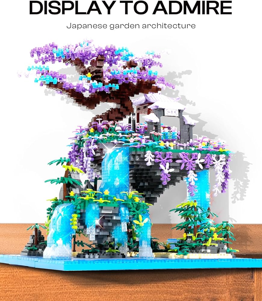 تصميم فريد: تم تصميم مجموعة بناء شجرة أزهار الكرز الرائعة بشكل فريد مع تعليق الجزيرة في الهواء ومدعومة بشلال. تحتوي الجزيرة العائمة على قصر محاط بالنباتات والزهور الجميلة. يتميز التصميم العام بنمط معماري ياباني قوي، ونموذج البناء ذو الخيوط الخفيفة أكثر واقعية. سوف تندهش عند الانتهاء منه
