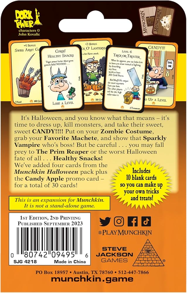 It's Halloween, and you know what that means -- it's time to dress up, kill monsters, and take their sweet, sweet CANDY!!!! Put on your Zombie Costume, grab your Favorite Machete, and show that Sparkly Vampire who's boss! But be careful . . . you may fall prey to The Prim Reaper or the worst Halloween fate of all . . . Healthy Snacks! We've added four cards from the Munchkin Halloween pack, the Candy Apple promo card, and 10 blank cards so you can make up your own tricks and treats! This is an expansion for Munchkin. It is not a stand-alone game.
