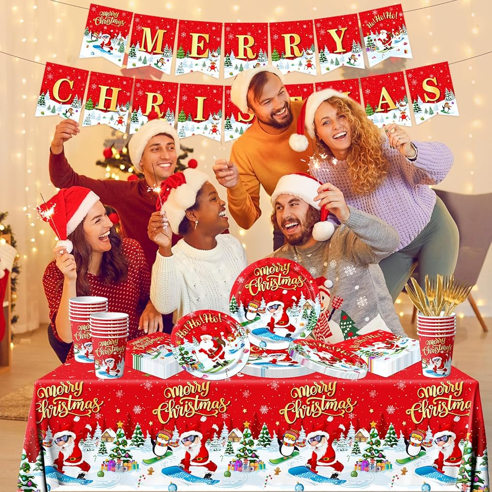 لوازم حفلات عيد الميلاد أدوات المائدة، 142 قطعة مجموعة أواني طعام عيد الميلاد للاستعمال مرة واحدة وأكواب مناديل مفرش المائدة، أطباق سانتا لعيد الميلاد وديكورات حفلات عيد الميلاد للأطفال
