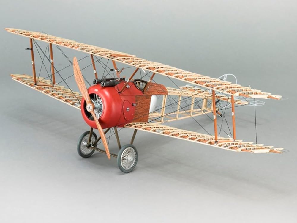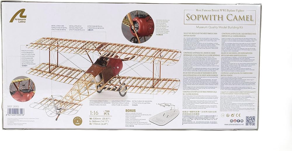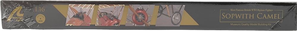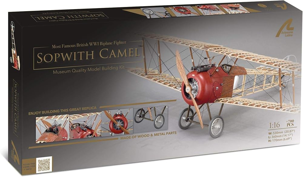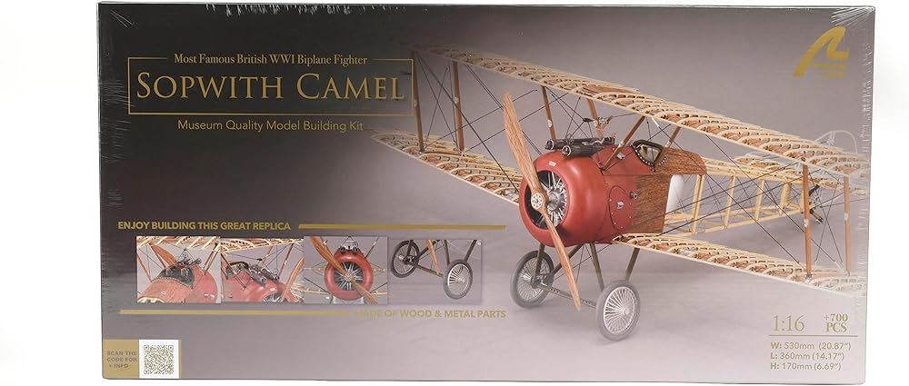 Sopwith Camel model is at a scale of 1:16. Once it is built, this aircraft model measures 20.86'' (530mm) wingspan, 14.17'' (360mm) length and 6.69'' (170mm) height. The model includes decals, thus achieving even greater realism.