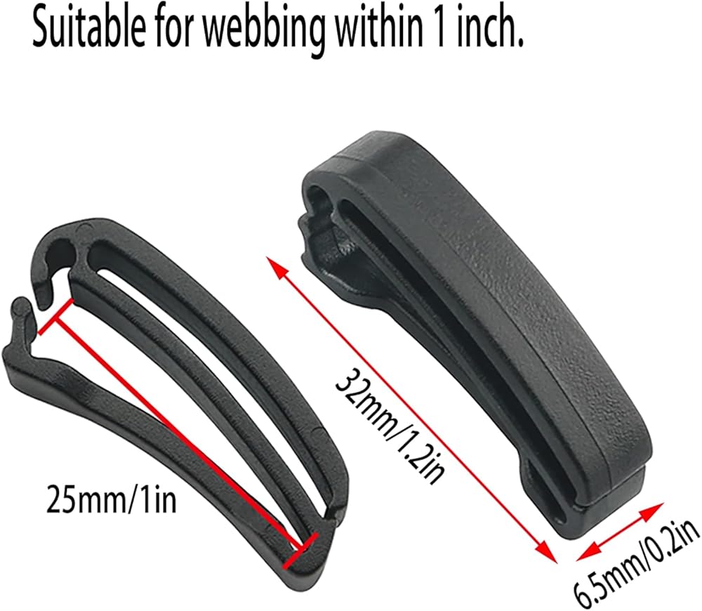 • Package Includes:12pcs webbing fixing clip buckles; the quantity is enough for your daily use needs, suitable for 1 inch webbing, please measure the width of the webbing before purchasing.