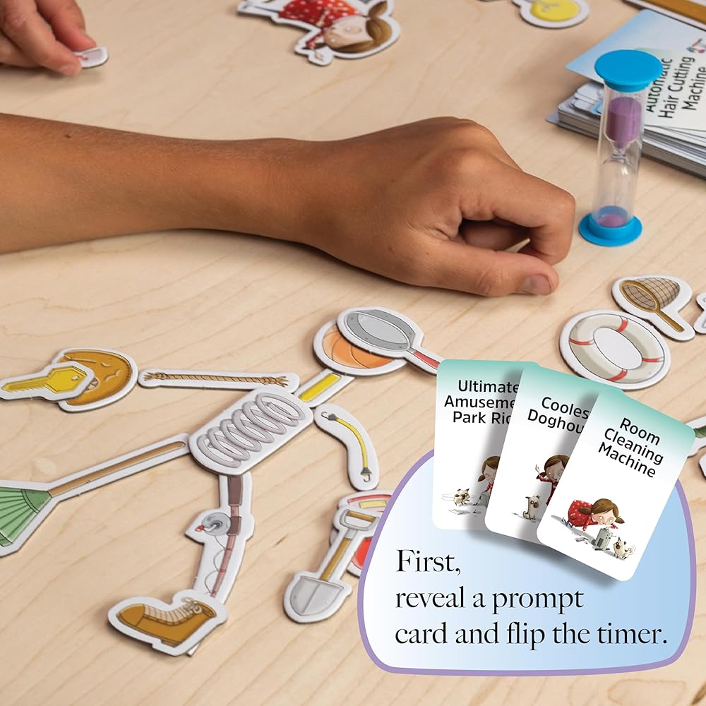 Dump the 200 odds and ends onto the table, draw a prompt card, and flip the timer. Everyone races to grab what they need to build a device that matches the prompt MAGNIFICENTLY. Then, everyone gets to explain why their invention is the MOST magnificent!