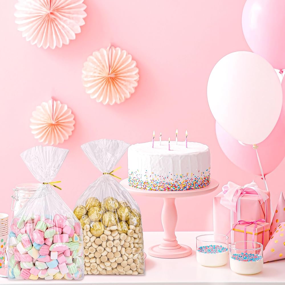 【تغليف رائع】تتميز أكياس السيلوفان هذه بلمسة نهائية شفافة تظهر النضارة والألوان النابضة بالحياة لحلوياتك الشهية. تعتبر حقائب التشيلو المقواة هذه الخيار الأمثل لتزيين مكافآتك والمخابز والحرف اليدوية وتغليف الهدايا بشكل جميل.