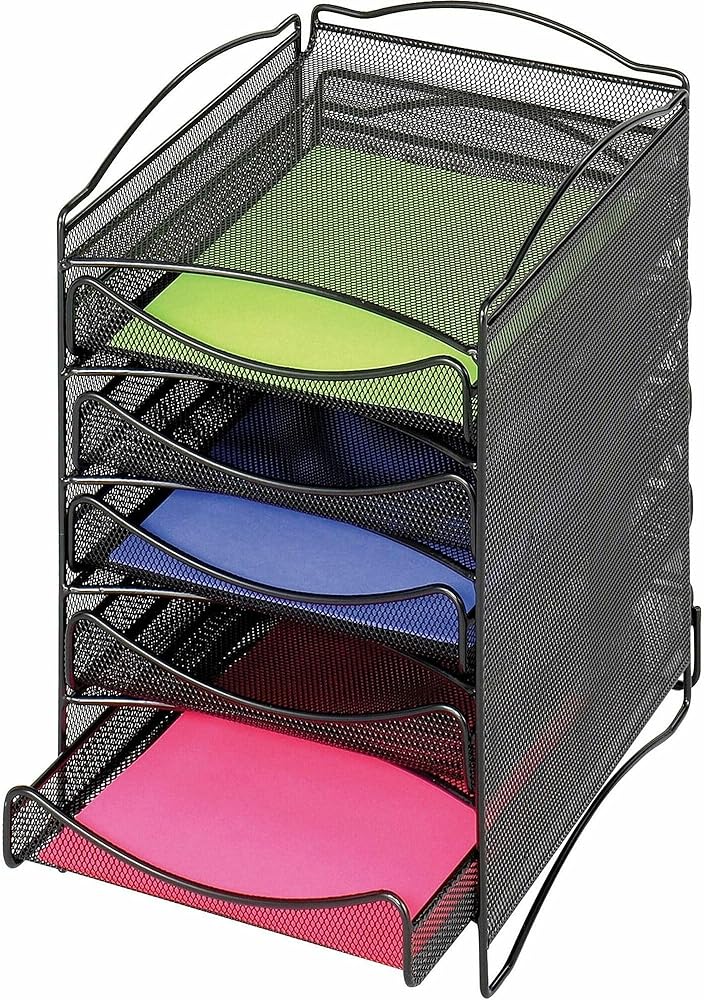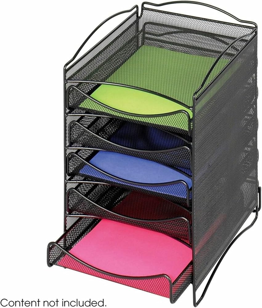Onyx Mesh Literature Organizer offer an intriguing design and a smart way to make efficiency more convenient. Features a simple, modern design with 12 letter size horizontal trays 9.5"W x 12.25"D x 1.75"H that hold up to 5 lbs. each of file folders or papers. Connector clips are also included allowing units to be easily stacked up to 2 high. Steel mesh construction with durable powder coat finish. Fully assembled.