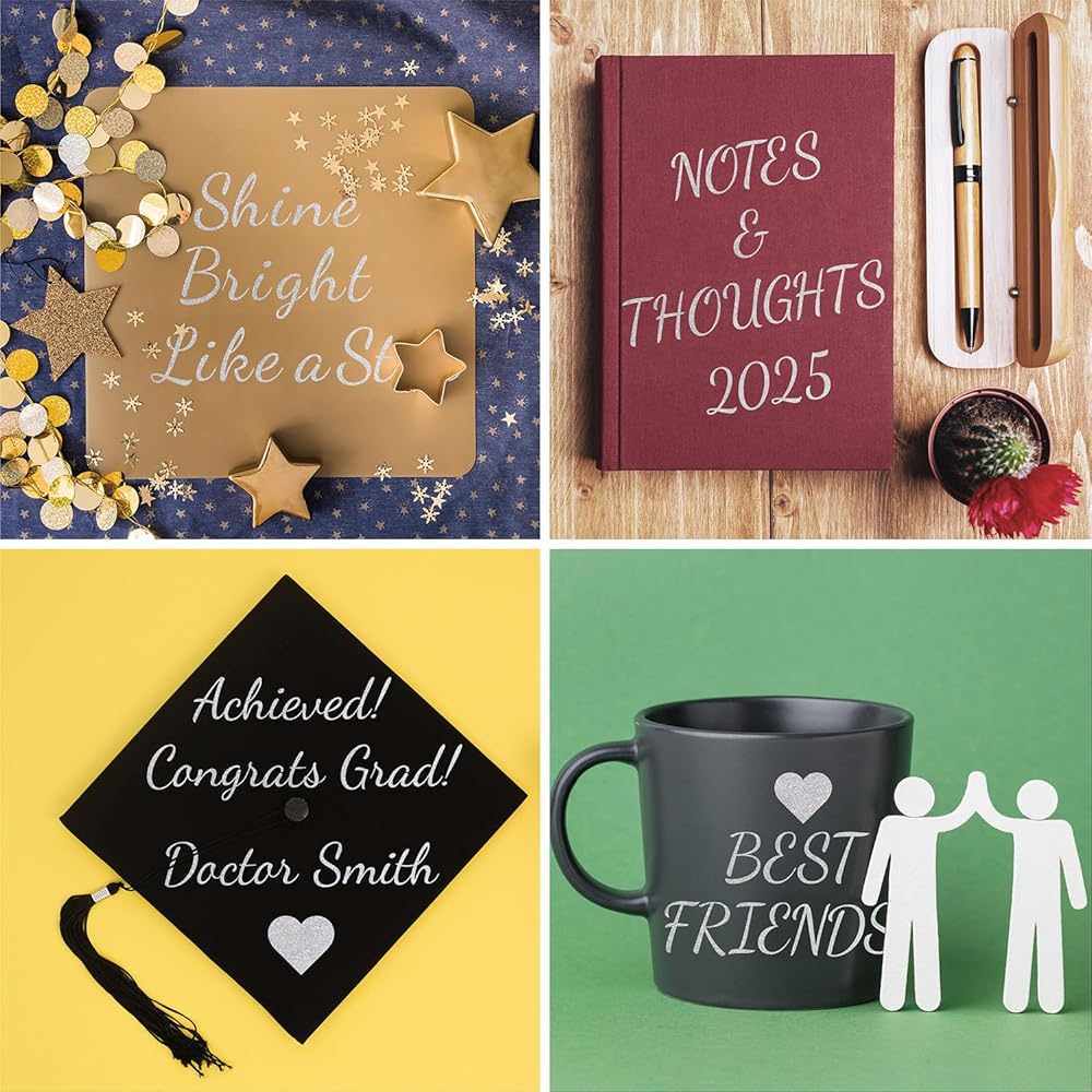 This set of glitter letter stickers can be applied to any smooth surface, like graduation cap decoration, Christmas decoration, scrapbooking,water bottles,mailbox,cards,glass storage jars, office folders, posters,bulletin board, mailboxes,birthday, wedding,perfect for children, friends and family, Add fun to your life