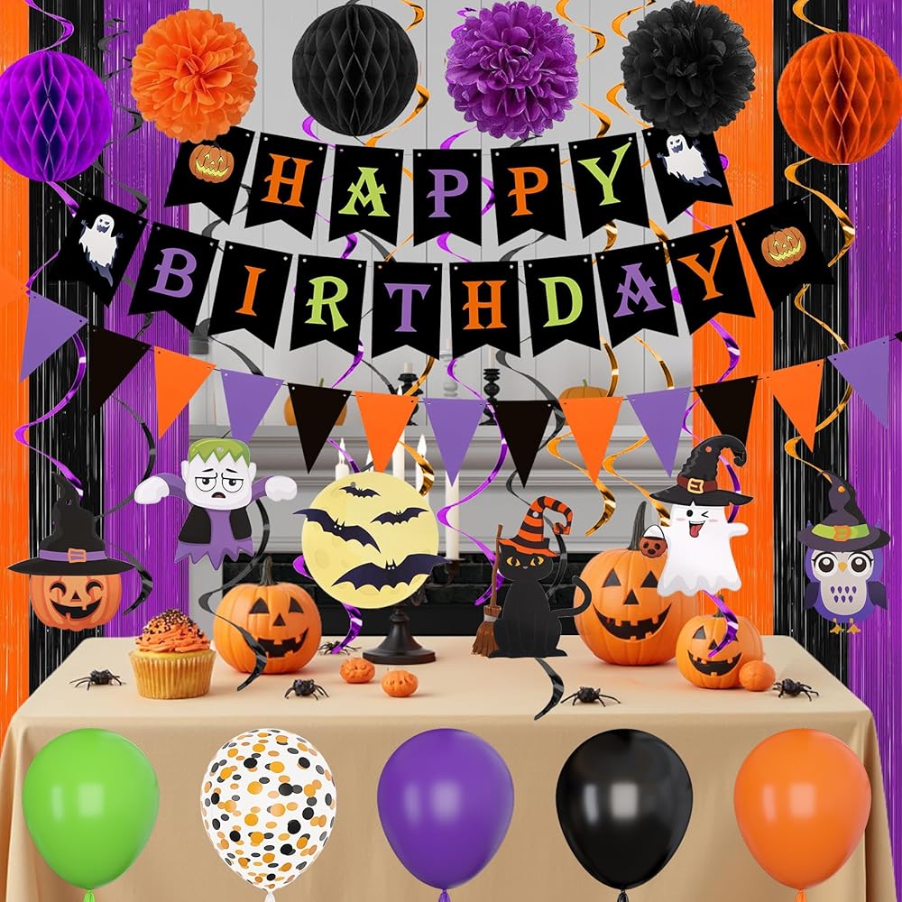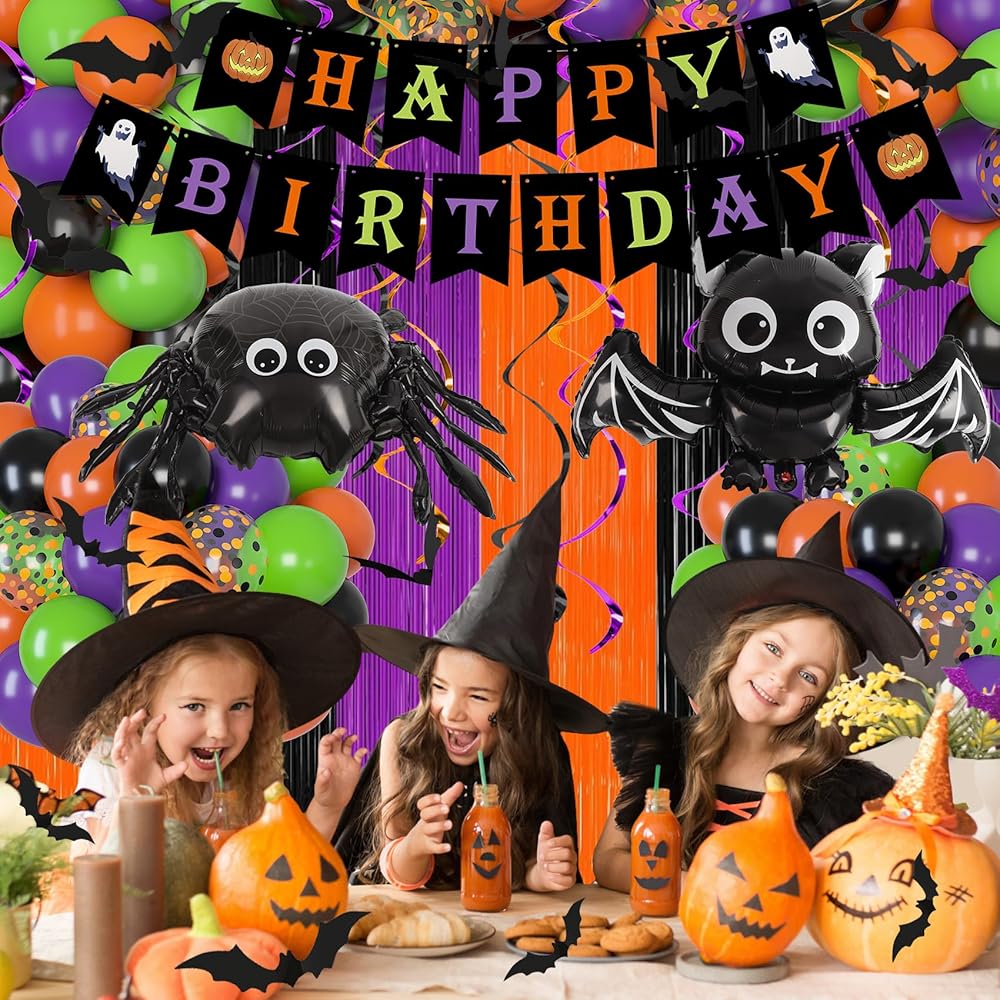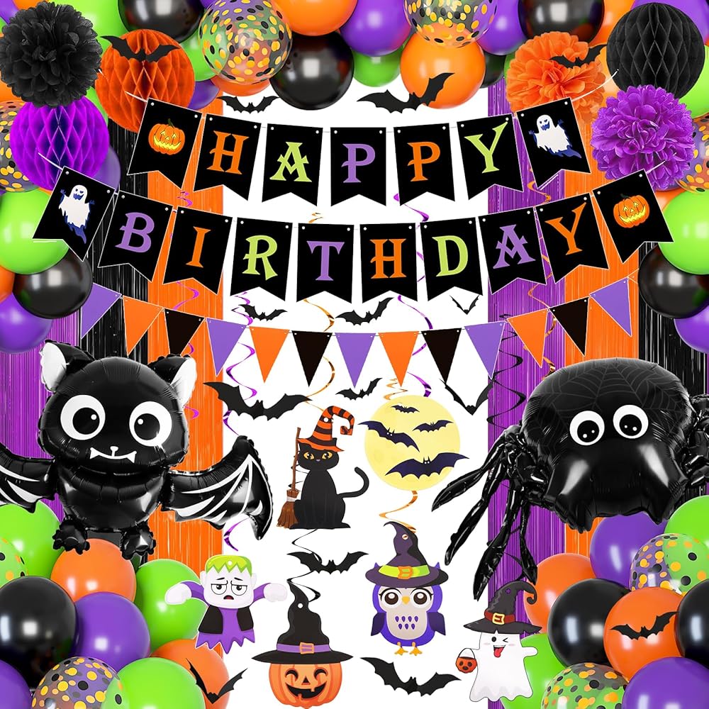 Ouddy Life 96 قطعة من ديكورات حفلات عيد الهالوين، لافتة عيد ميلاد سعيد، بالونات رقائق الخفافيش العنكبوتية، كرات قرص العسل، كرات ورقية، دوامة معلقة، ستارة مهدبة، لوازم حفلات الهالوين