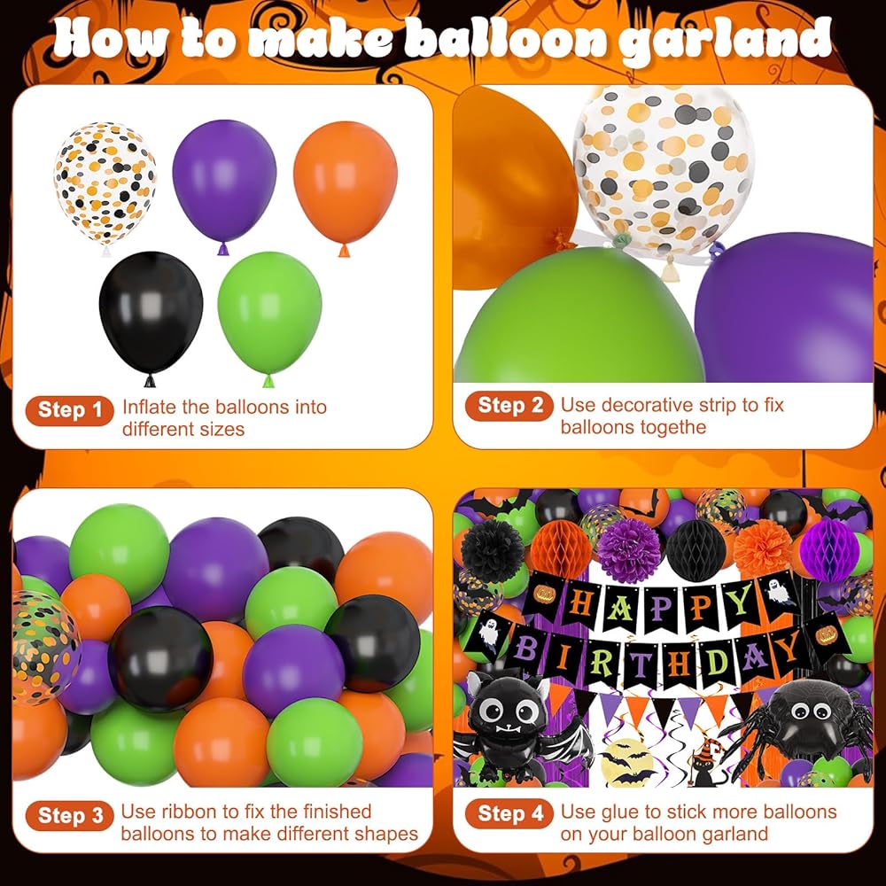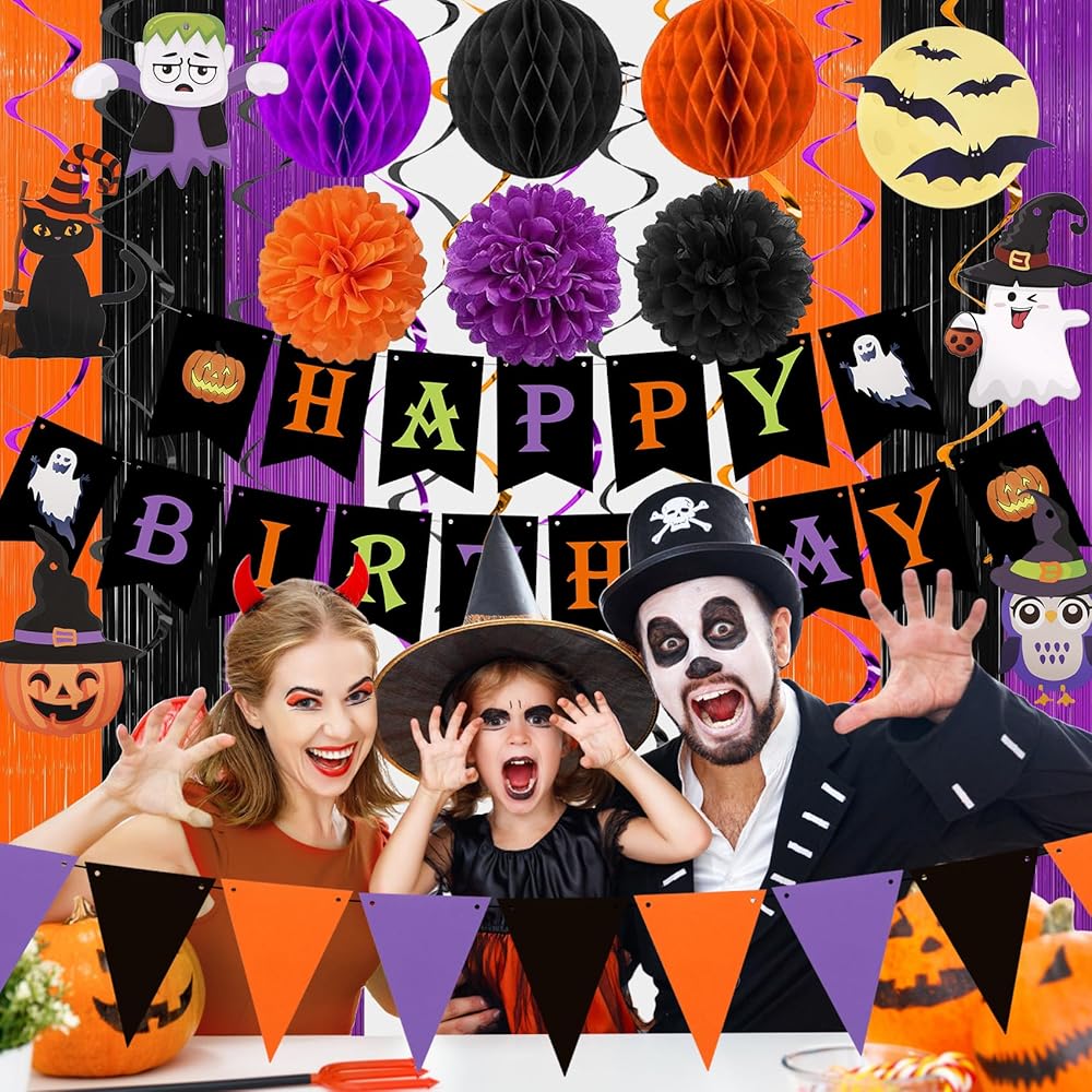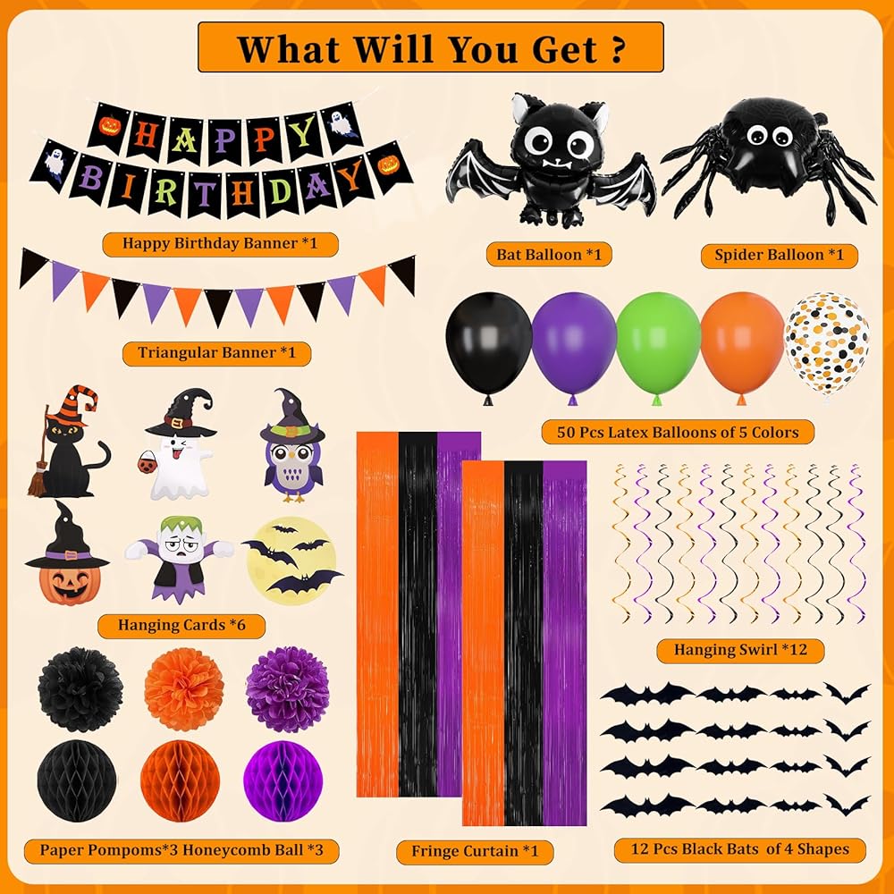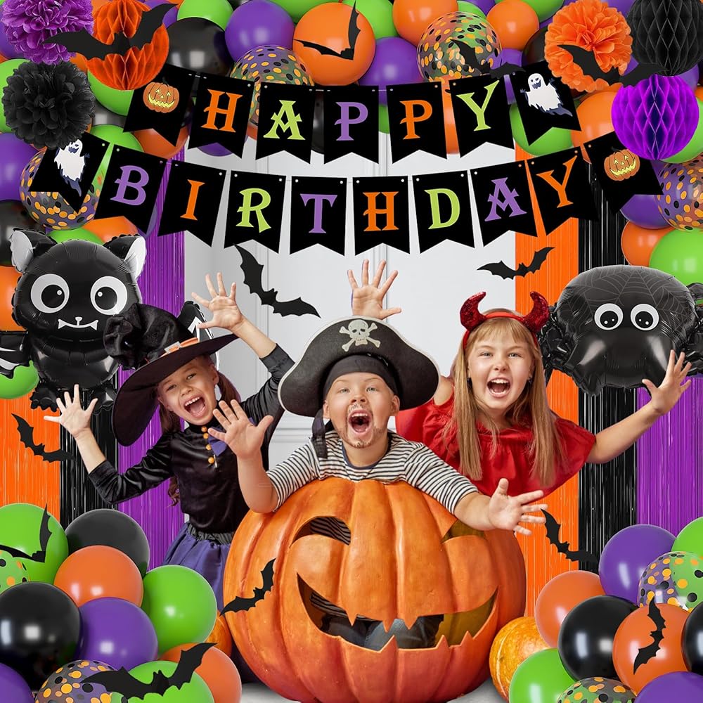 Ouddy Life 96 قطعة من ديكورات حفلات عيد الهالوين، لافتة عيد ميلاد سعيد، بالونات رقائق الخفافيش العنكبوتية، كرات قرص العسل، كرات ورقية، دوامة معلقة، ستارة مهدبة، لوازم حفلات الهالوين