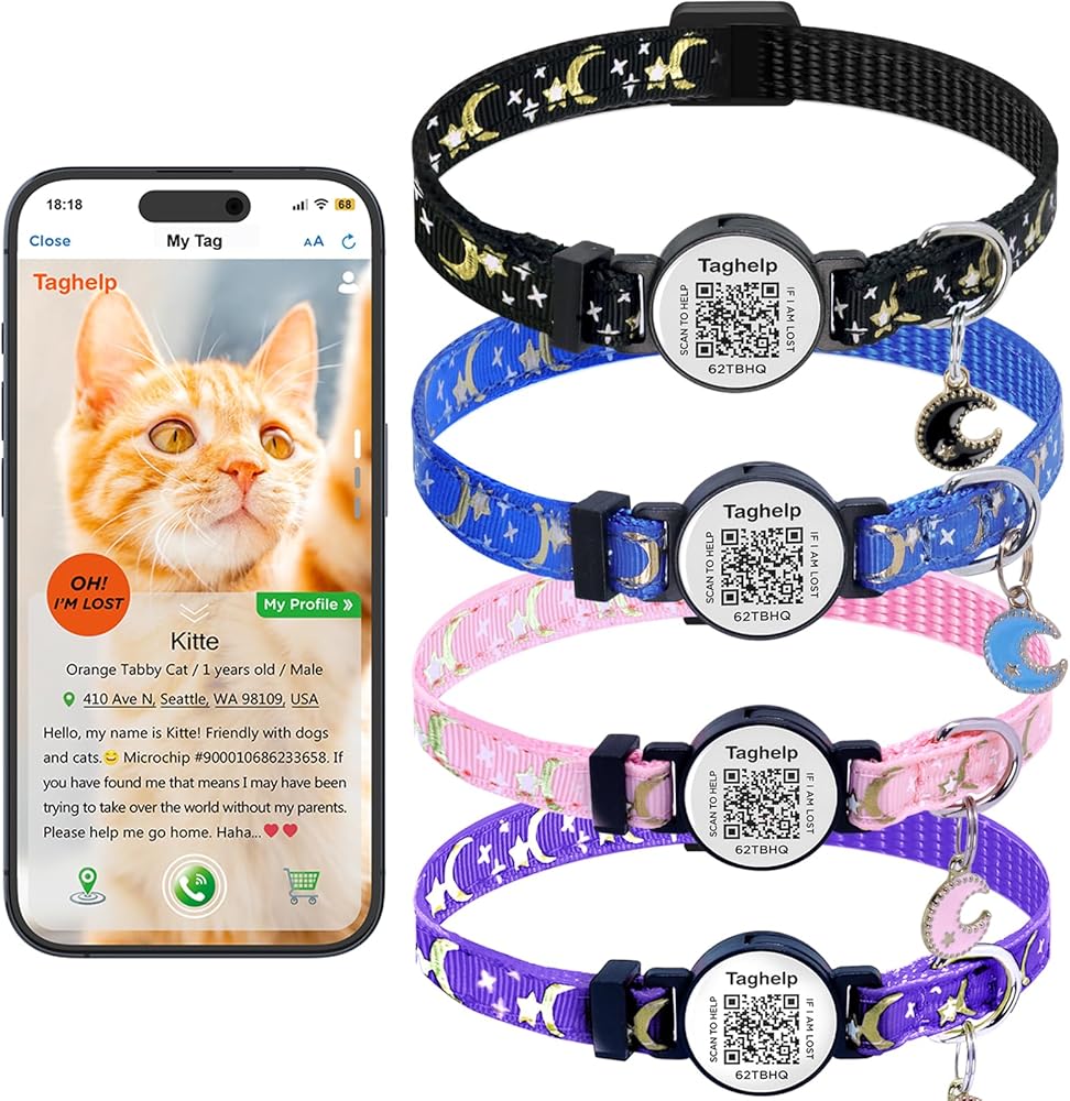 1. 【المواد والمتانة】--أطواق القطط المنفصلة مصنوعة من نايلون عالي الجودة، ناعم الملمس، مما يسمح لقطتك بارتدائها كل يوم بشكل مريح. 【ذكي ومريح】من السهل استخدام رمز الاستجابة السريعة الذكي. لا حاجة إلى تطبيق أو رسوم اشتراك أو بطارية