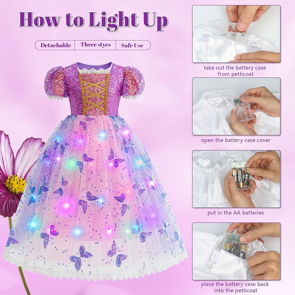 تحويل الضوء السحري: فستان الأميرة الساحر من LURLEEZ، المدمج مع سلسلة أضواء خرافية، يحول أي مكان إلى أرض عجائب مبهرة. تخلق الأضواء القابلة للإزالة الموجودة على التنورة الداخلية تأثيرًا ساحرًا، مما يضمن أن يسرق طفلك الصغير العرض في كل مناسبة.