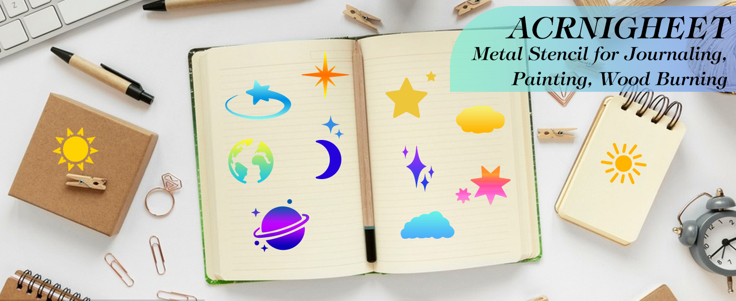 • التعبير الإبداعي: ​​استخدم استنسل الطلاء المعدني لإضافة لمسة فنية إلى إدخالات يومياتك، مما يخلق اهتمامًا بصريًا ولمسة شخصية. يمكن أن تلهم استنسلات ACRNIGHEET أفكارًا جديدة وتساعد في كسر العوائق الإبداعية، مما يشجع على تجربة تدوين أكثر تعبيراً.
