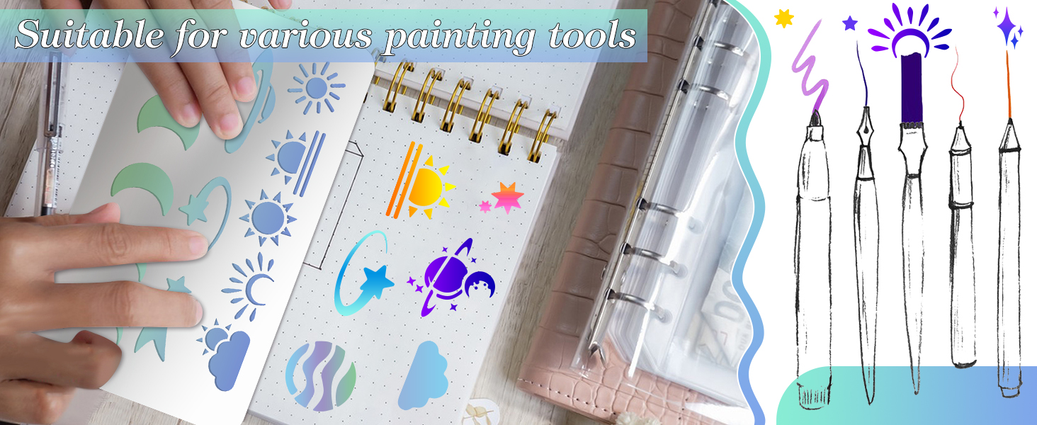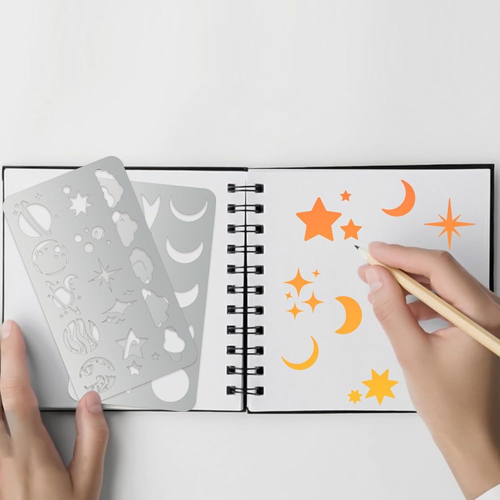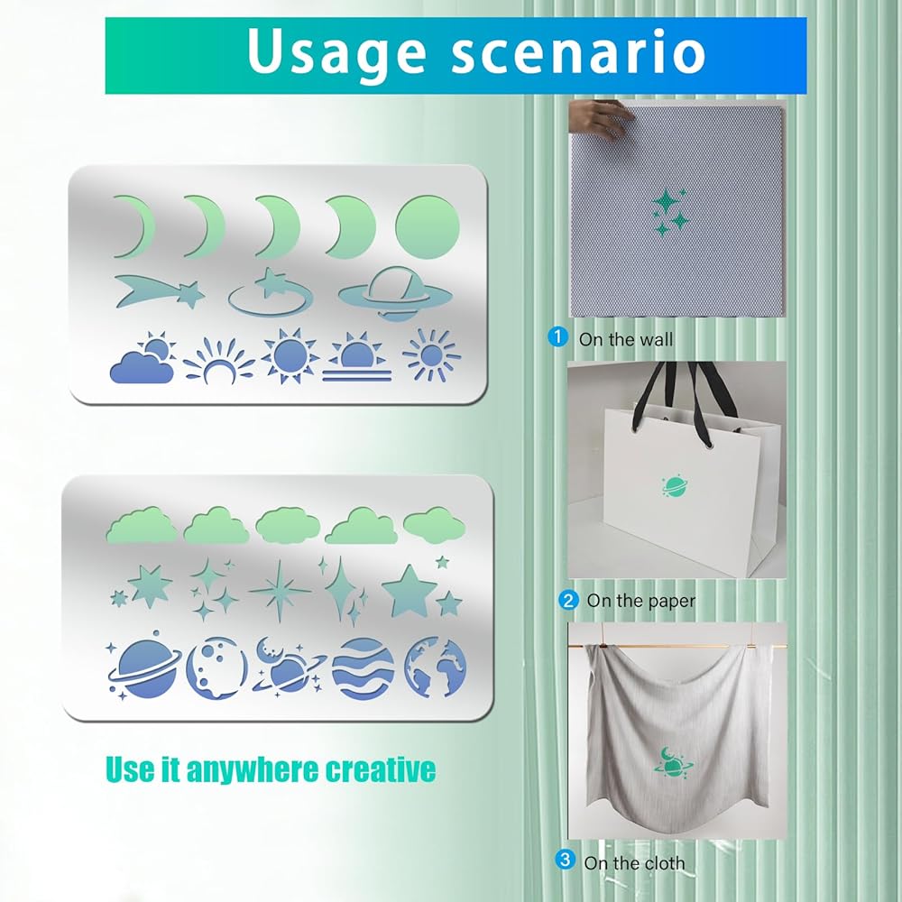 • طلاء مثل الفنان: تتضمن استنسل الحرف المعدنية DIY للرسم القابل لإعادة الاستخدام قطعتين من الاستنسل مقاس 7x4 بوصة، وهناك أنماط مثل المراحل القمرية، والطقس، والسحاب، والنجوم، والفضاء، وما إلى ذلك، والتي تبدو لطيفة جدًا وجميلة، ويمكن مزجها ومطابقتها بحرية لإنشاء مشاريعك الفنية المفضلة.