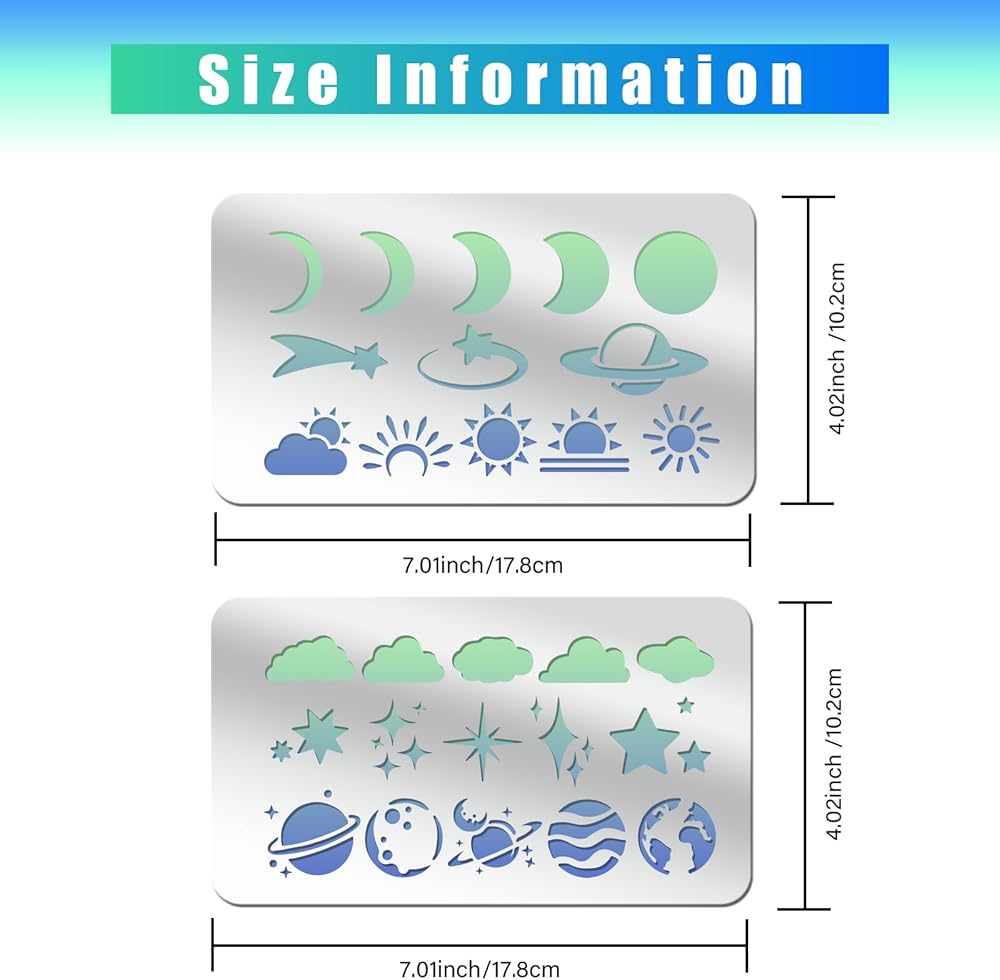 قطعتان من استنسل معدني لتدوين يوميات القمر والنجمة استنسل معدني لحرق الخشب واستنسل نقش الطقس على شكل كوكب استنسل طلاء قابل لإعادة الاستخدام للقماش استنسل معدني فني للرسم مقاس 7 × 4 بوصة