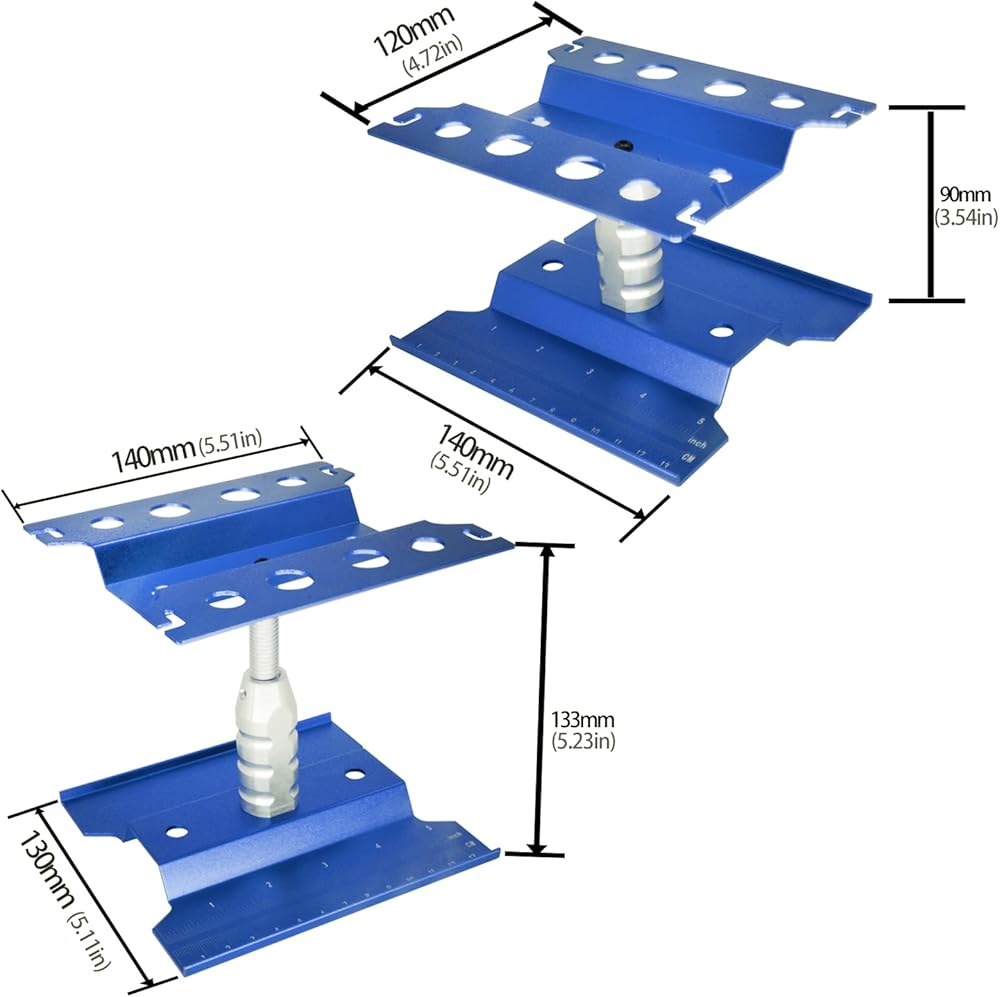 • 1/10 scale rc stand: 360-degree rotation; Adjustable Height:3.54in-5.23in; Built-in holes for rebuilding shocks; Engraved with the scale centimeter and inch, you can easily measure the length of the part at any time.