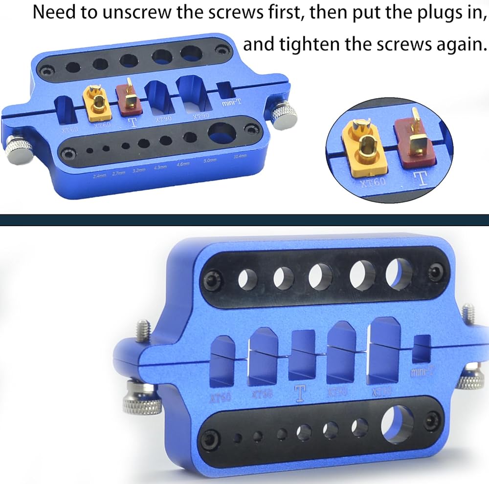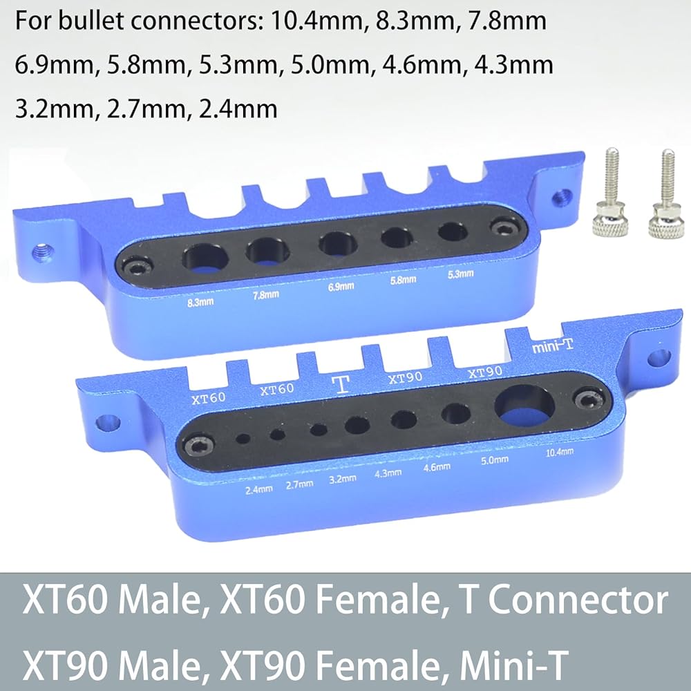 • Welding station: Material: Aluminum (sturdy and durable, dissipates heat quickly). It has pre made holes to support 18 different sizes,list of the holes as follows: XT60 Male, XT60 Female, T Connector, XT90 Male, XT90 Female, Mini-T; For bullet connectors you are offered the following sizes: 10.4mm, 8.3mm, 7.8mm, 6.9mm, 5.8mm, 5.3mm, 5.0mm, 4.6mm, 4.3mm, 3.2mm, 2.7mm, 2.4mm.