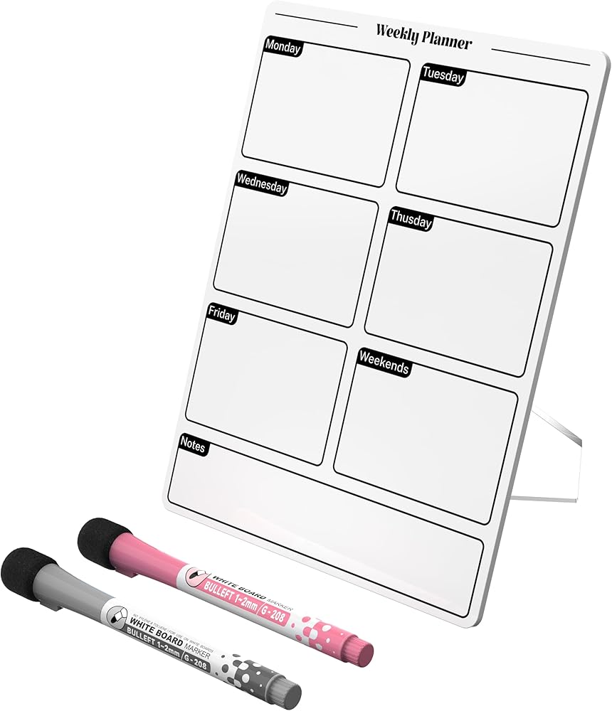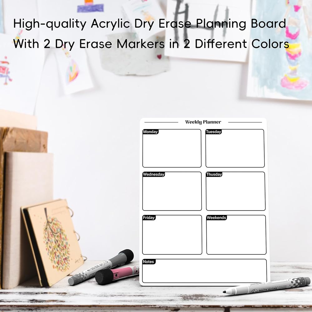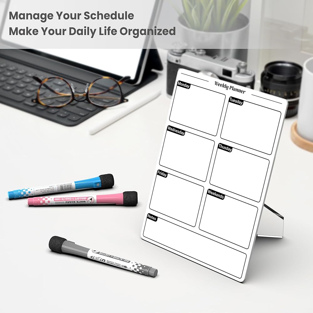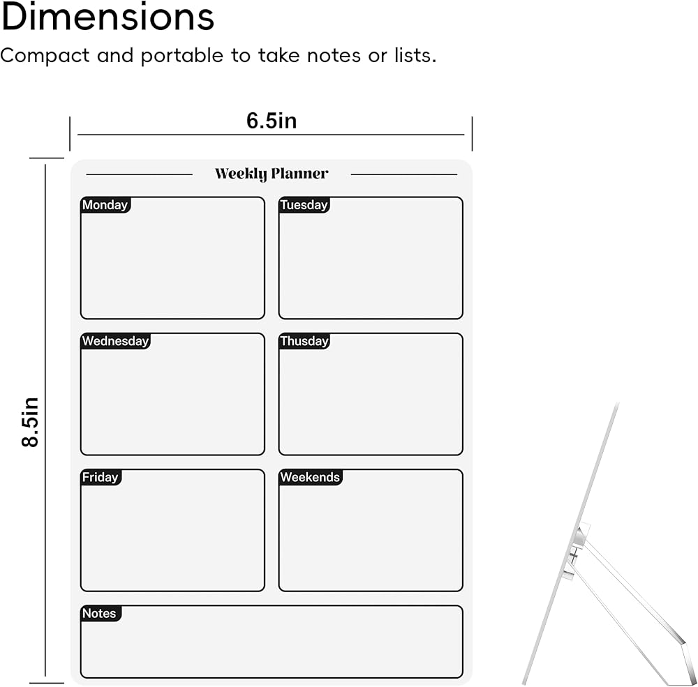 مريحة ومتعددة الاستخدامات: تعتبر لوحة التخطيط الجافة المصنوعة من الأكريليك مثالية للحفاظ على خططك الأسبوعية منظمة مباشرة على مكتبك. يمكن وضعه بشكل مسطح لسهولة الكتابة والتخطيط، أو يمكن إعداده باستخدام الحامل للعرض والعرض.