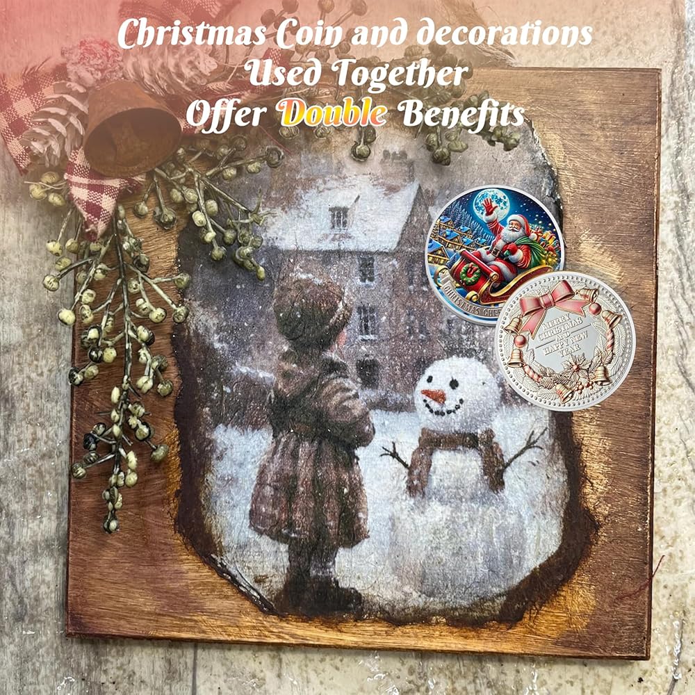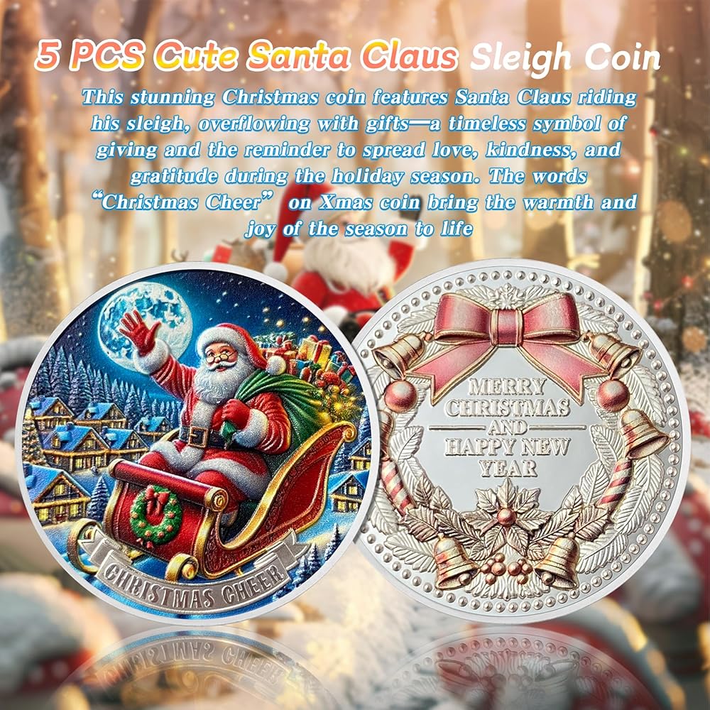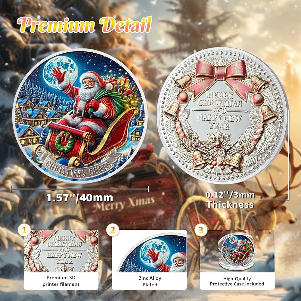 🎅عيد ميلاد سعيد: تتميز عملة عيد الميلاد المذهلة هذه بسانتا كلوز وهو يركب مزلقته ويفيض بالهدايا - وهو رمز خالد للعطاء وتذكير بنشر الحب واللطف والامتنان خلال موسم العطلات. الكلمات "Christmas Cheer" الموجودة على عملة عيد الميلاد تجلب الدفء والبهجة لهذا الموسم إلى الحياة، بينما يلهم البدر المتوهج والنجوم المتلألئة في الخلفية الأمل والعجب. إنه يجلب كل روعة ودفء الموسم إلى الحياة