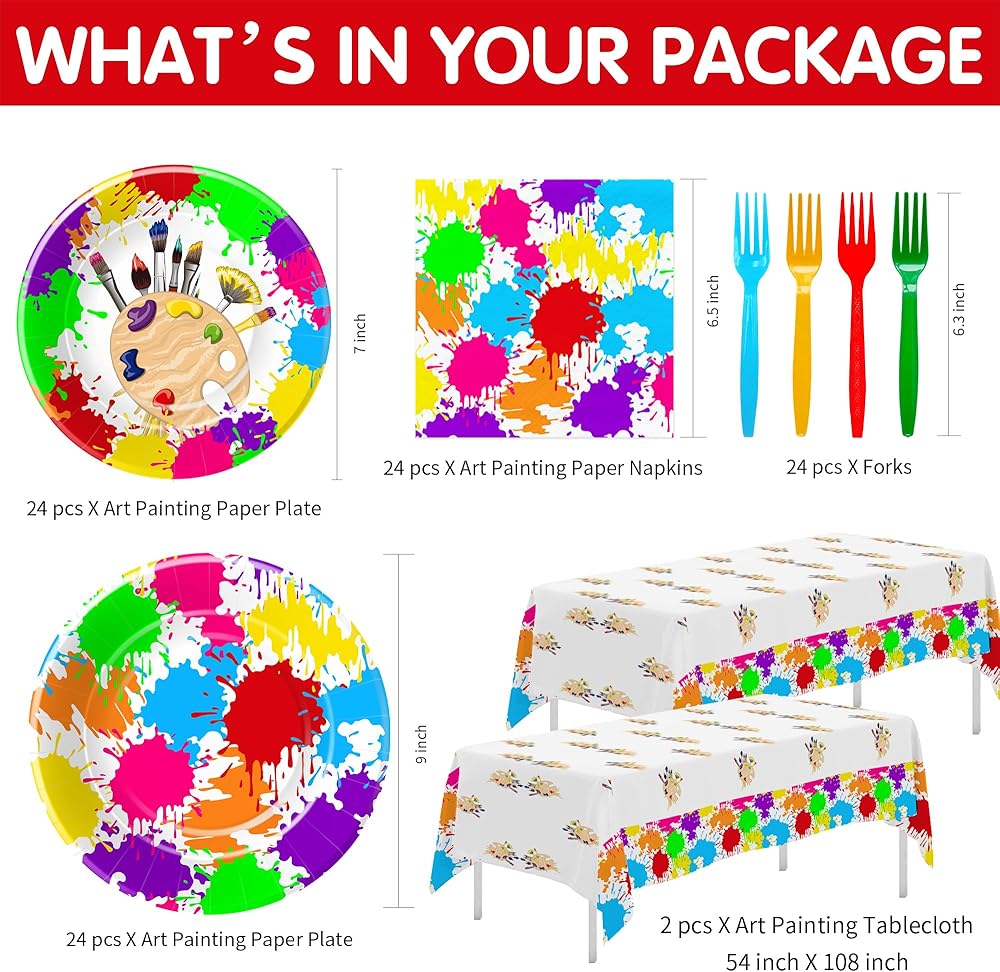 • 【Party Package】Art party decorations tableware included 24pcs 9'' dinner plates, 24pcs 7'' dessert plates, 24pcs paper napkins, 24 sets disposable forks, 2pcs art paint tablecloth, suitable for paint party decorations