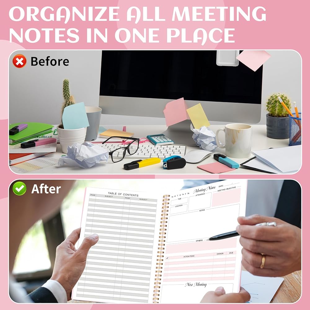 【تخطيط جيد والحفاظ على التنظيم】يحتوي دفتر مخطط الاجتماعات على عناصر أساسية للاجتماع، مثل الوقت والموقع والحاضرين وهدف الاجتماع والملاحظات وعناصر العمل، وما إلى ذلك، مما يساعدك على تنظيم الاجتماعات وتتبعها بشكل أفضل. ويتضمن أيضًا جدول محتويات لمساعدتك في العثور على معلومات الاجتماع بسهولة
