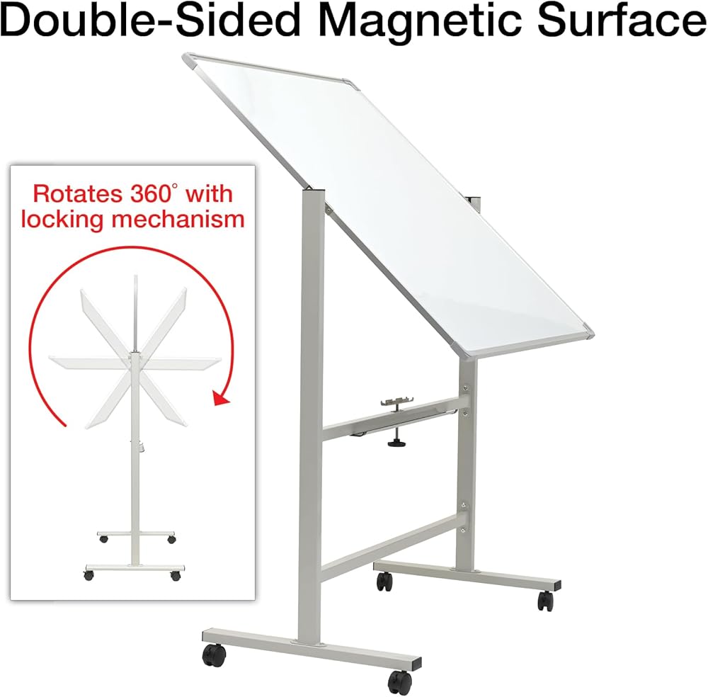 This dual sided 36"x 42" whiteboard features easy 360-degree rotation and locks into position with a bottom lock clip. Perfect setup for classrooms, offices, conference rooms, and home use. Comes with a silver finished aluminum frame that is both lightweight for easy mobility and durable. Four lockable casters are included to keep your whiteboard in place. Reversible Whiteboard on Wheels - 36"x 42", includes marker tray.