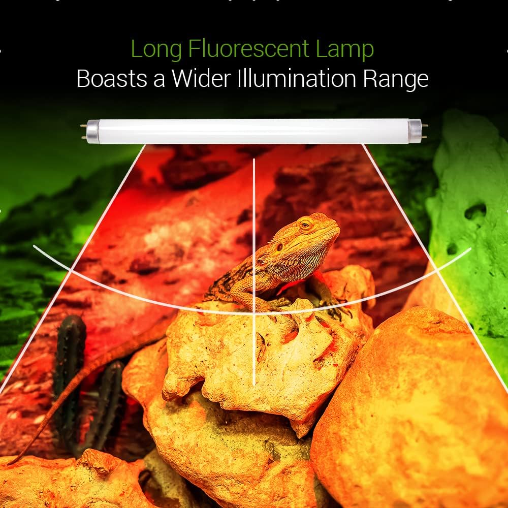 نطاق إضاءة أوسع: يبلغ طول لمبة الإضاءة فوق البنفسجية فئة B 10.0 T8 للزواحف 60.96 سم، مما يجعلها مثالية للاستخدام مع موائل الزواحف الأكبر. تبلغ المسافة من المصباح إلى موقع تشمس الزواحف حوالي 10 بوصات (25 سم).