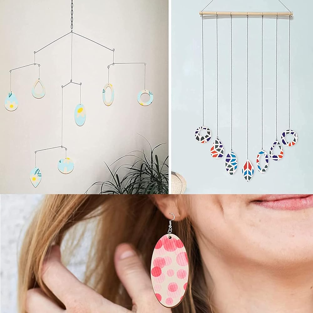 ستكون الفراغات الخشبية البيضاوية غير المكتملة مطلية أو ملطخة بشكل رائع. يمكن مطابقتها مع حلقات القفز والخطافات، بالإضافة إلى السلاسل والخرز الزجاجي والخرز الأكريليكي لتكون أقراطًا وقلائد شائعة وما إلى ذلك.