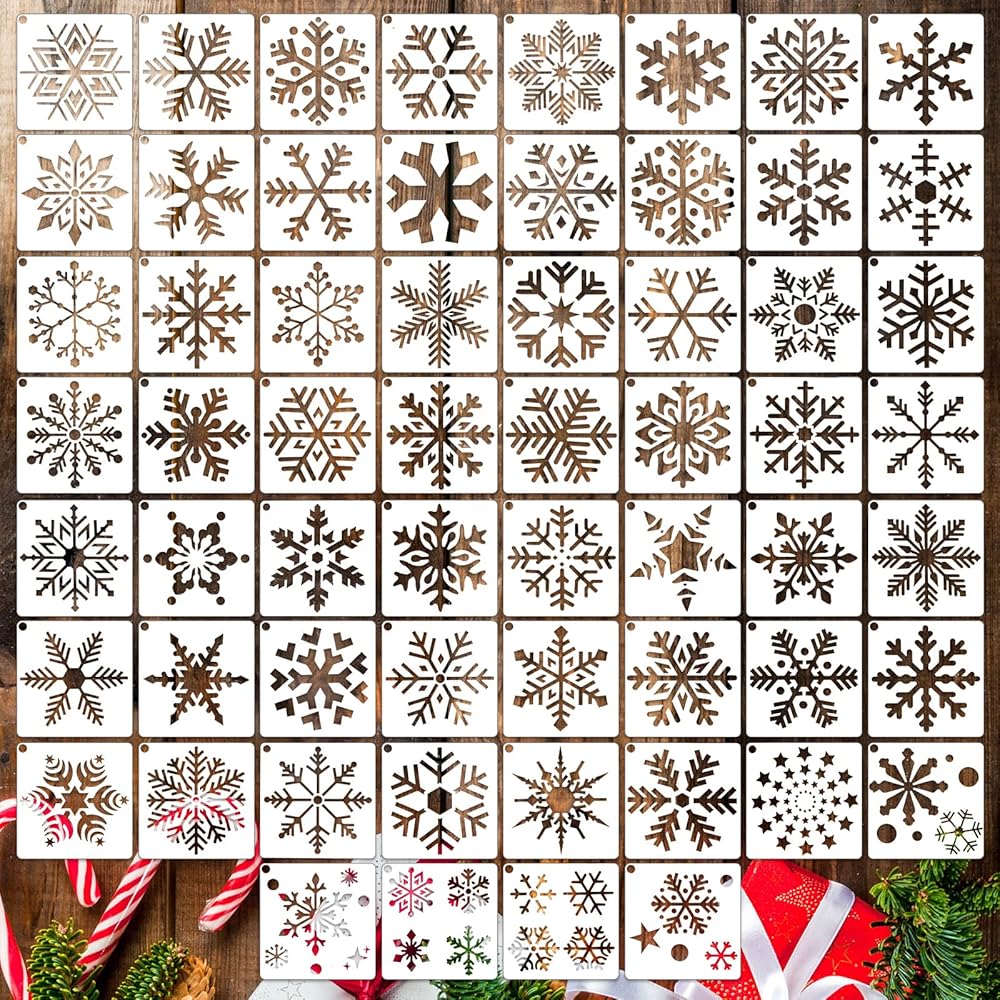60 قطعة من استنسل عيد الميلاد للرسم على الخشب مقاس 3 × 3 بوصة استنسل ندفة الثلج الصغيرة قابل لإعادة الاستخدام استنسل عطلة عيد الميلاد للفن الحرفي رش ورق الحائط هدية ديكور المنزل (نمط ندفة الثلج)