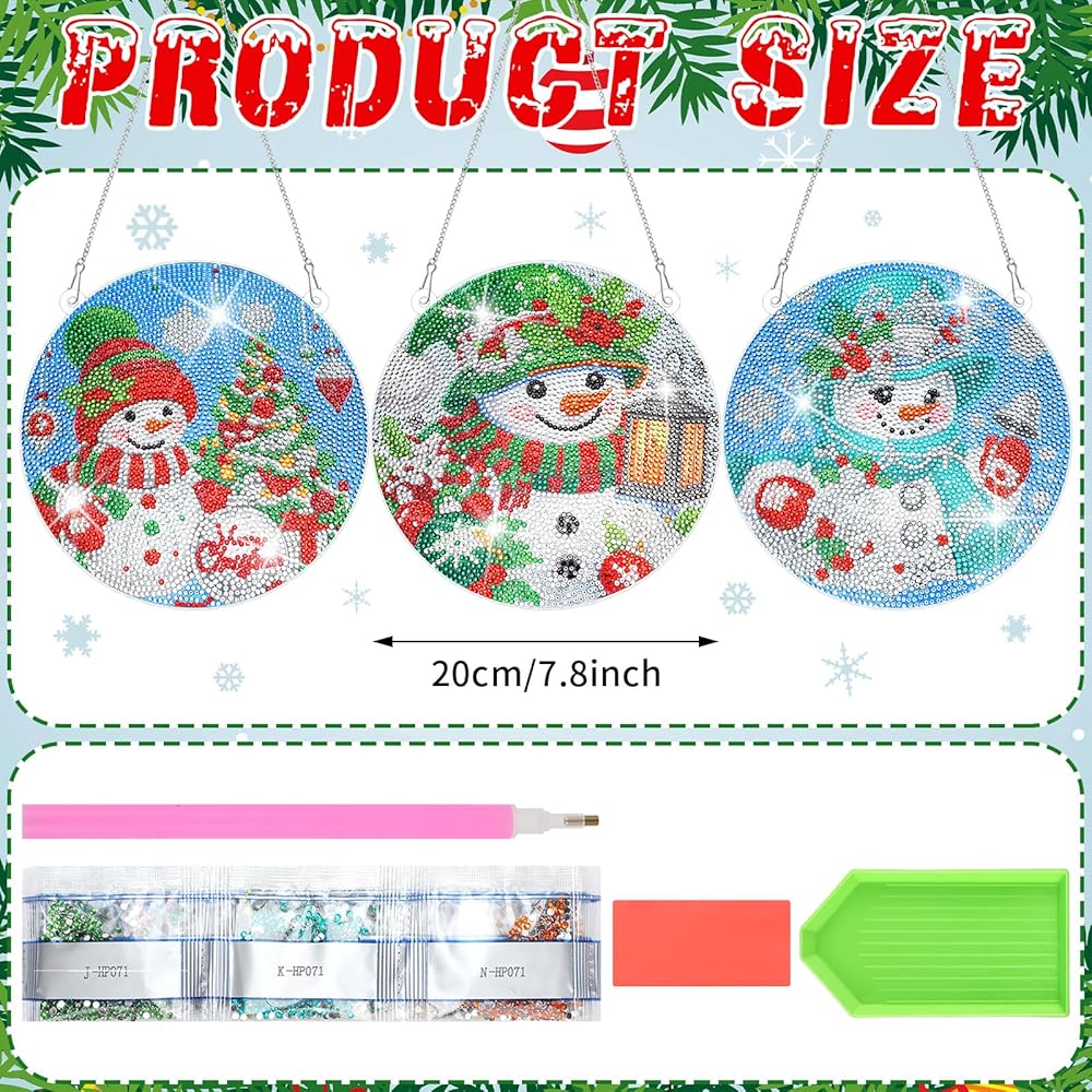 • Diamond Art Pendant Set: you will receive 3 sets of Christmas diamond art ornaments size about 7.87 x 7.87 inch, 3 iron chains, 1 diamond pen, 1 clay, 1 tray, 3 sets of beads; Our toolkit includes most you need, you don't need to purchase other tools