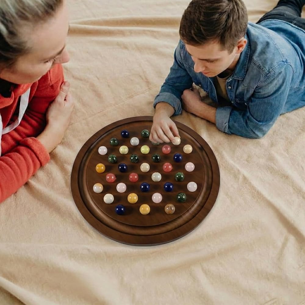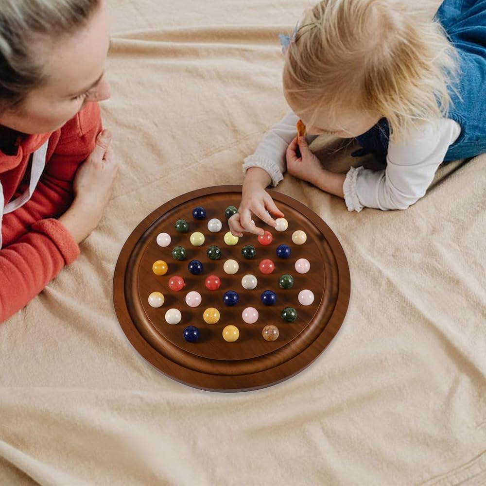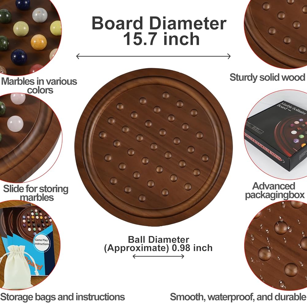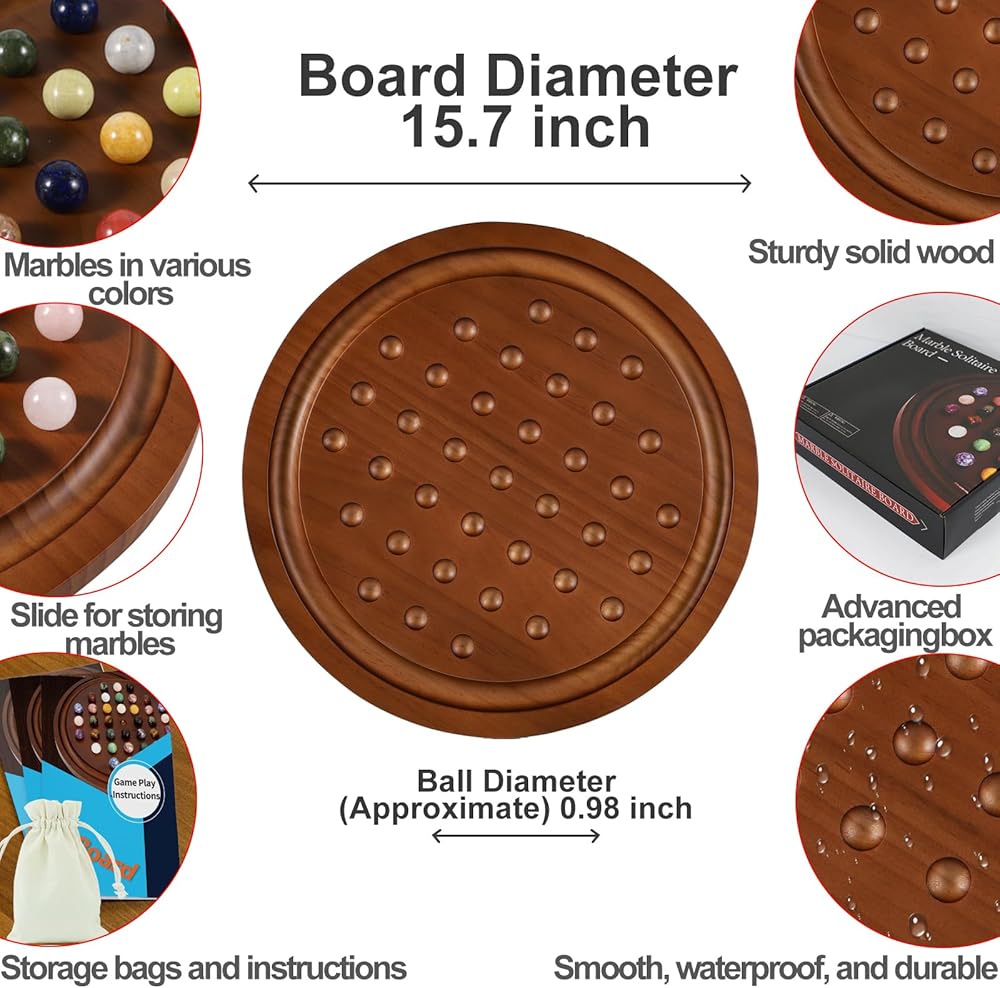 مجموعة خشبية فاخرة: هذه نسخة مطورة من لعبة سوليتير اللوحية، مع 4 أخاديد إضافية لجعل اللعبة أكثر تحديًا. يضمن اللوح الخشبي الصلب القوي استخدامًا طويل الأمد! تشتمل اللعبة على لوحة ألعاب مصممة بشكل جميل، و36 كرة رخام، وحقيبة تخزين، ودليل تعليمات، وصندوق ملون. يبلغ قطر اللوح الدائري 12.6 بوصة، ويبلغ قطر الكرات الرخامية 0.8 بوصة. تم تصميم الأخاديد الموجودة على حواف اللوحة لتخزين الرخام المحذوف!