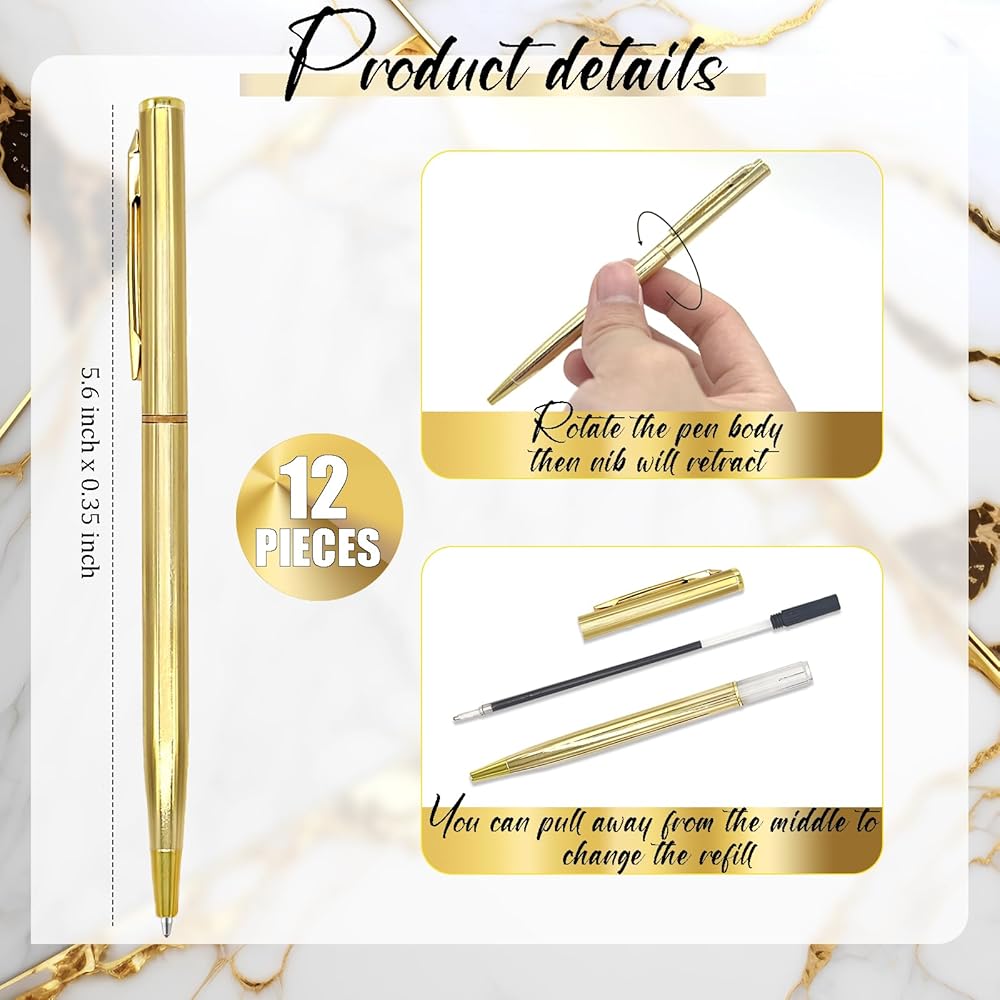 Portable design: Each gold pen is designed with a reliable metal clip that easily attaches to a notebook, binder or pocket; it's retractable so you can twist to release the nib as you write