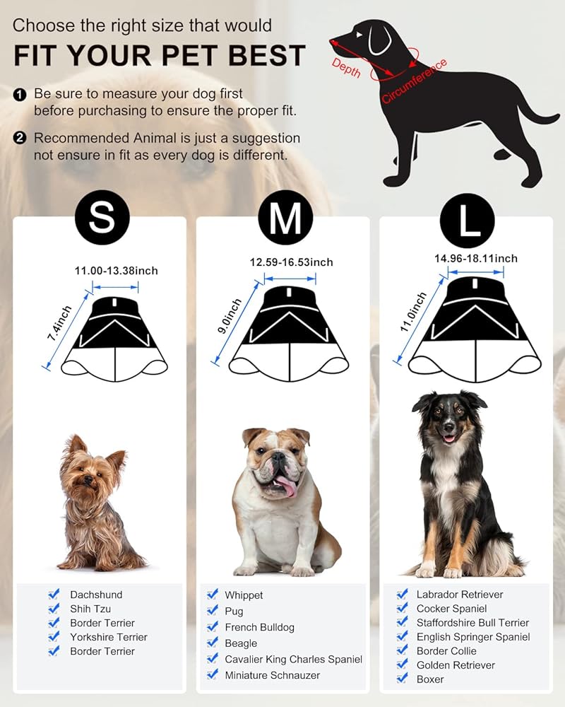 【HOW TO MEASURE】Before you buy this dog cone, please carefully measure neck circumference and neck to the nose measurements.Please refer to the detailed size chart according to the measurement method before purchasing.Neck Circumference: Use a soft tape measure to wrap it around the dog's neck tightly enough that you can't put your fingers inside.Depth: Measure the distance from the neck to the snout.Make sure the collar extends beyond the nose