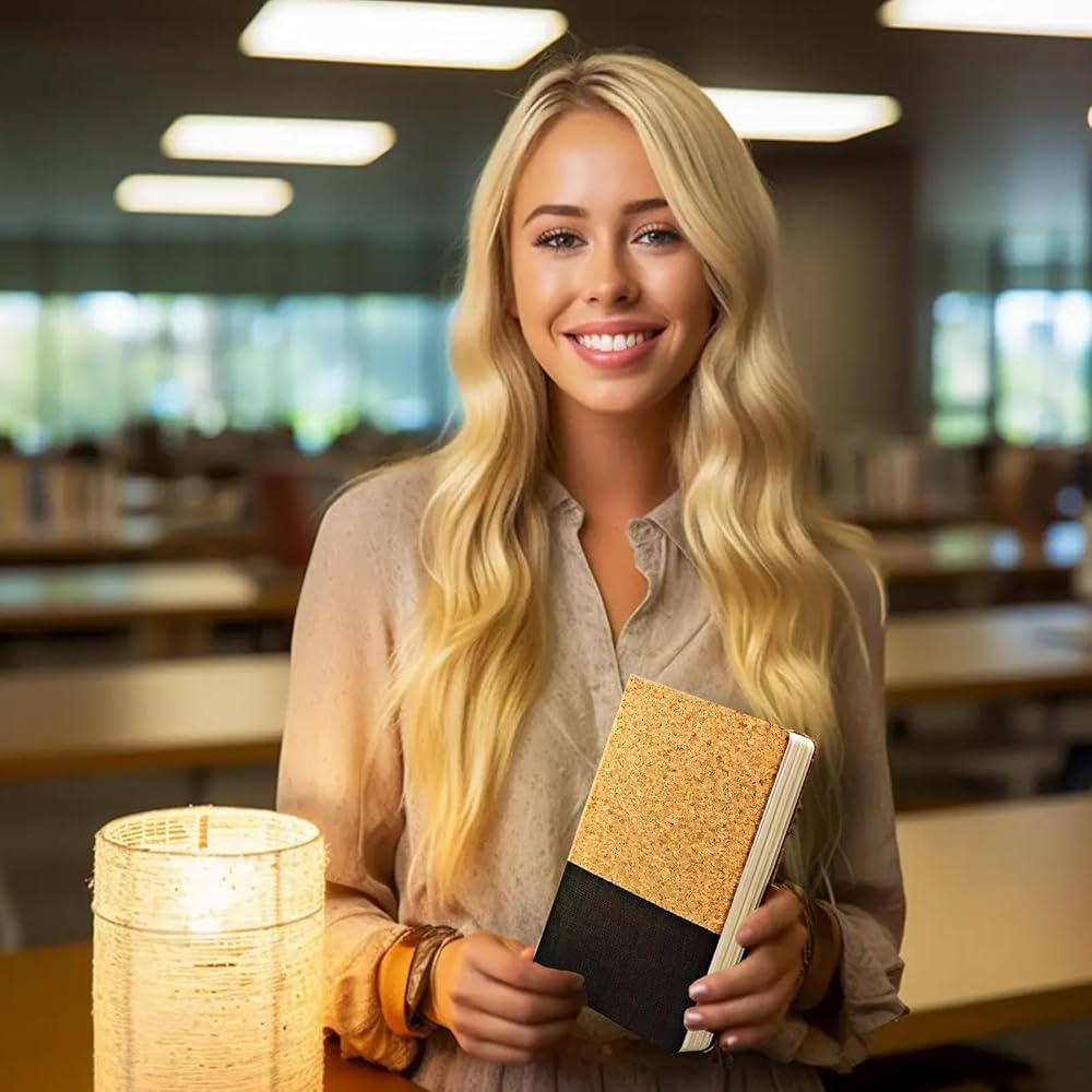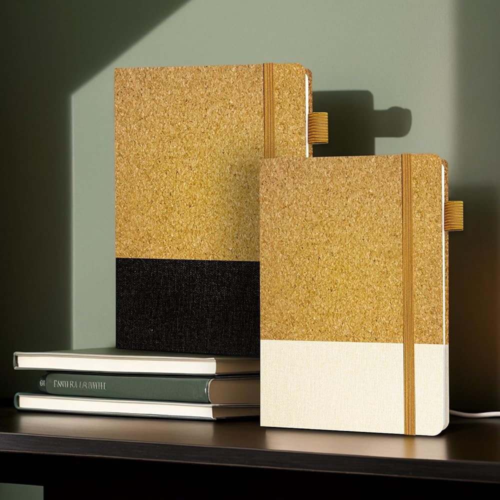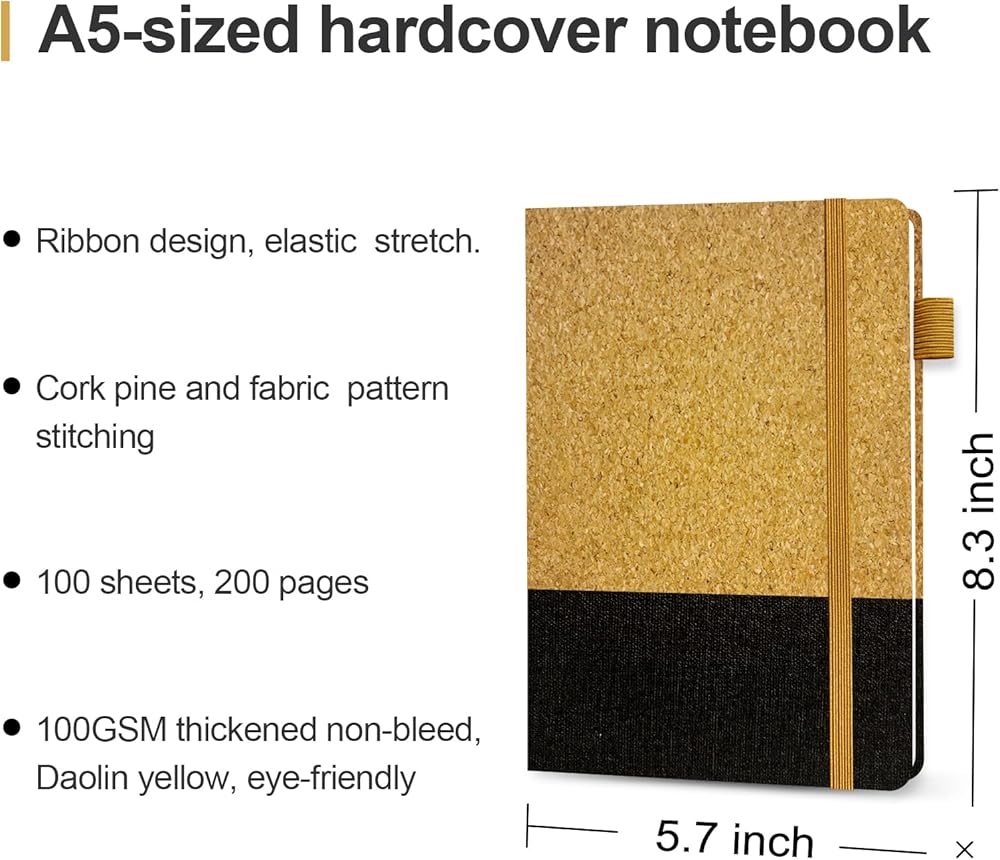 دفتر يوميات فريد من نوعه بغطاء من الفلين والقماش: يتميز دفتر يومياتنا بغطاء مزيج من الفلين والقماش الناعم، مما يوفر لمسة دافئة ومظهرًا أنيقًا. هذا التصميم المميز يجعلها هدية شخصية أو عمل مثالية، مثالية للرجال والنساء والطلاب والزملاء. لقد تم تصميمه لكسب الإطراء ويعمل كبديل للمجلات الجلدية عالية الجودة