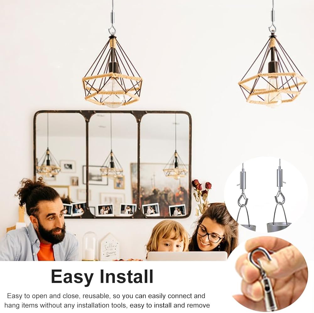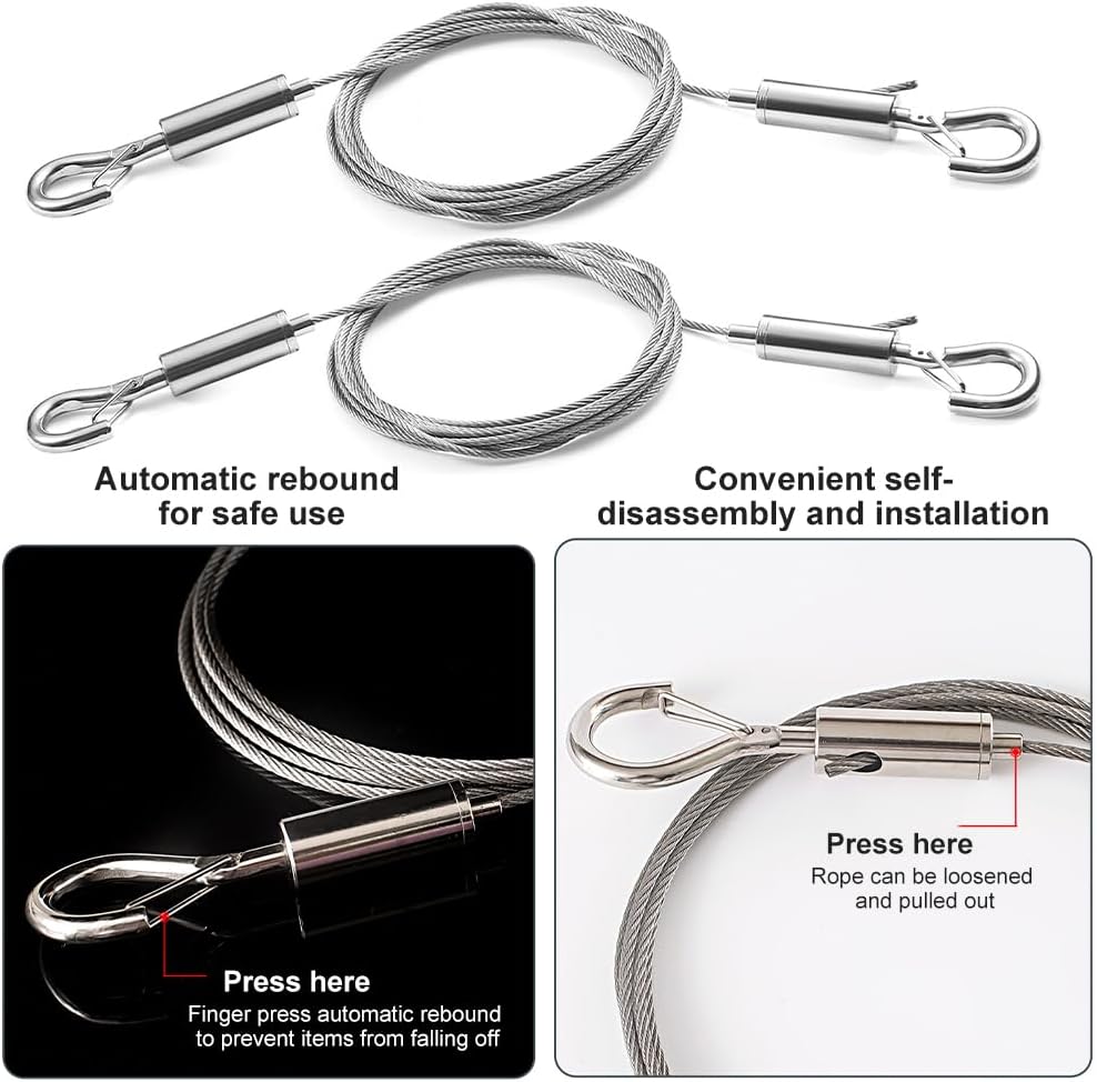【EASY INSTALL】The picture hanging wire has spring hooks on both ends, easy to open and close, reusable, so you can easily connect and hang items without any installation tools, easy to install and remove.