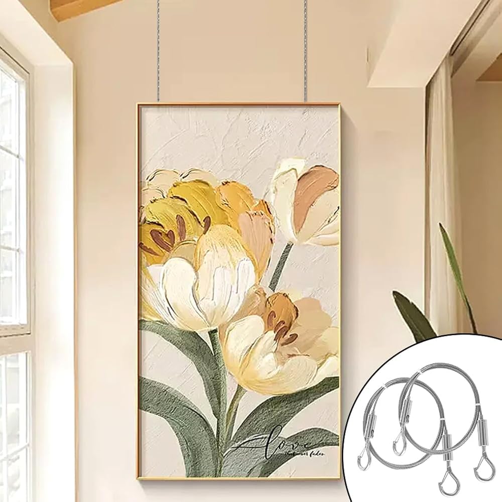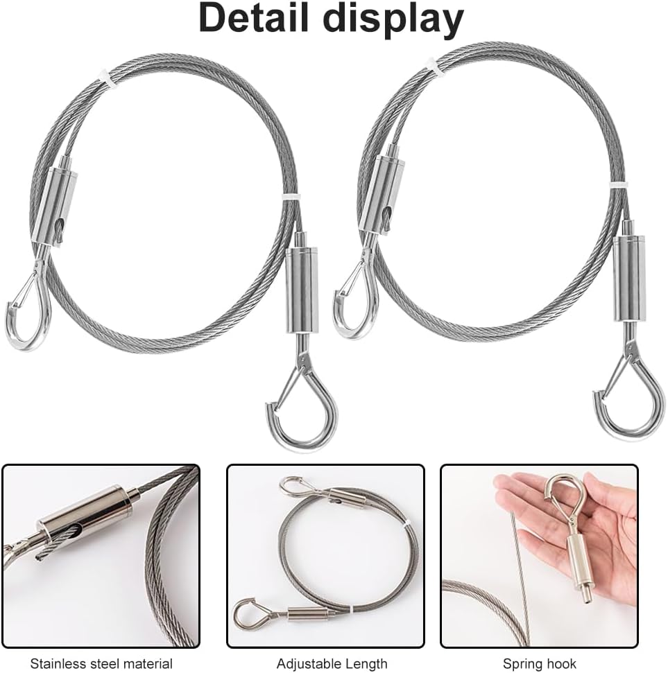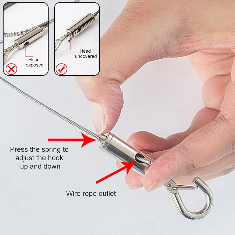 【ADJUSTABLE LENGTH】The total length of the picture hanging wire is about 1m/39.37inch, the length can be adjusted according to your own needs to meet your needs in different spaces. Just press and hold the adjusting column and drag the steel wire rope.
