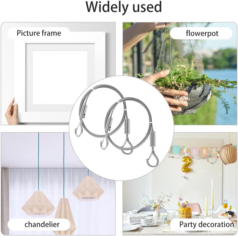 【WIDE APPLICATION】These steel picture hanging wires are suitable for indoor and outdoor, can be used for hanging picture frames, mirrors, paintings, chandeliers, plant pot hangings, signs, party decorations, curtains, etc.