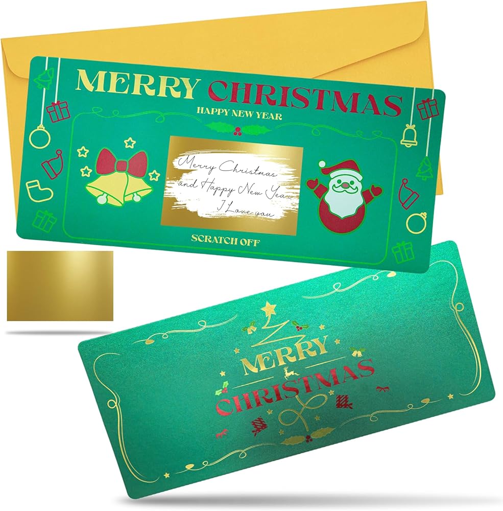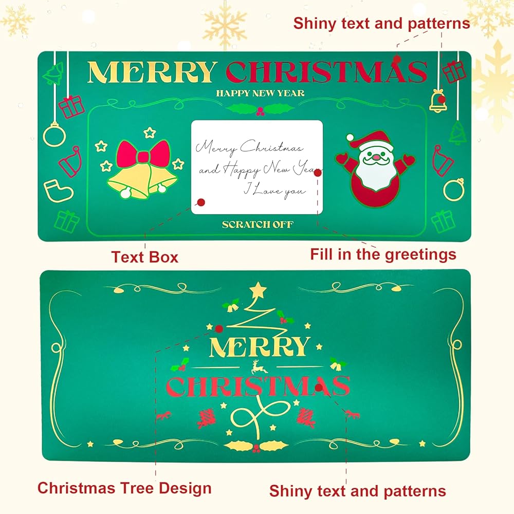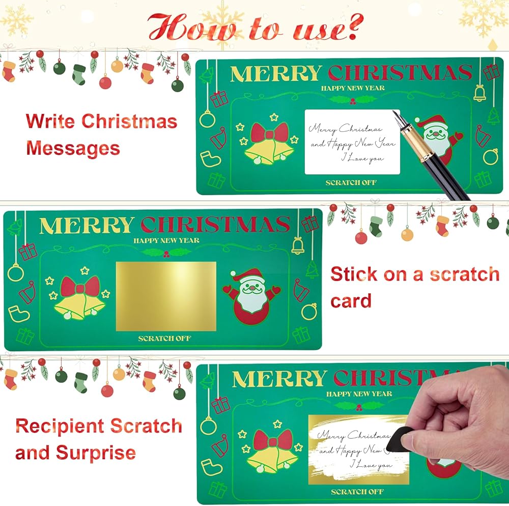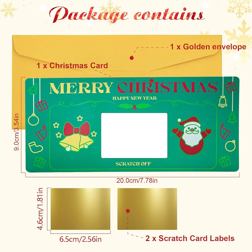 • 【مجموعة من 1 بطاقة خدش لعيد الميلاد】1 × بطاقة خدش لعيد الميلاد؛ 1 × ظرف ذهبي؛ 2 × ملصقات قابلة للخدش؛