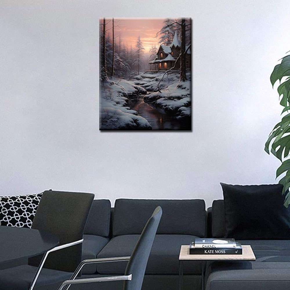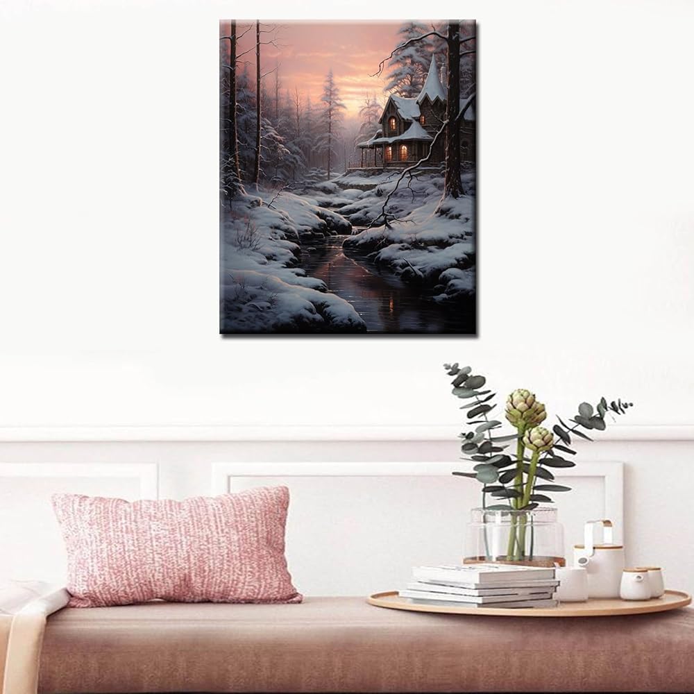 طلاء بالأرقام كابينة في مشهد ثلجي شتوي رسم يدوي على القماش، طلاء باستخدام فرش الطلاء ودهانات أكريليك، مثالي للطلاء بالأرقام للبالغين والأطفال المبتدئين بدون إطار 16 بوصة × 20 بوصة