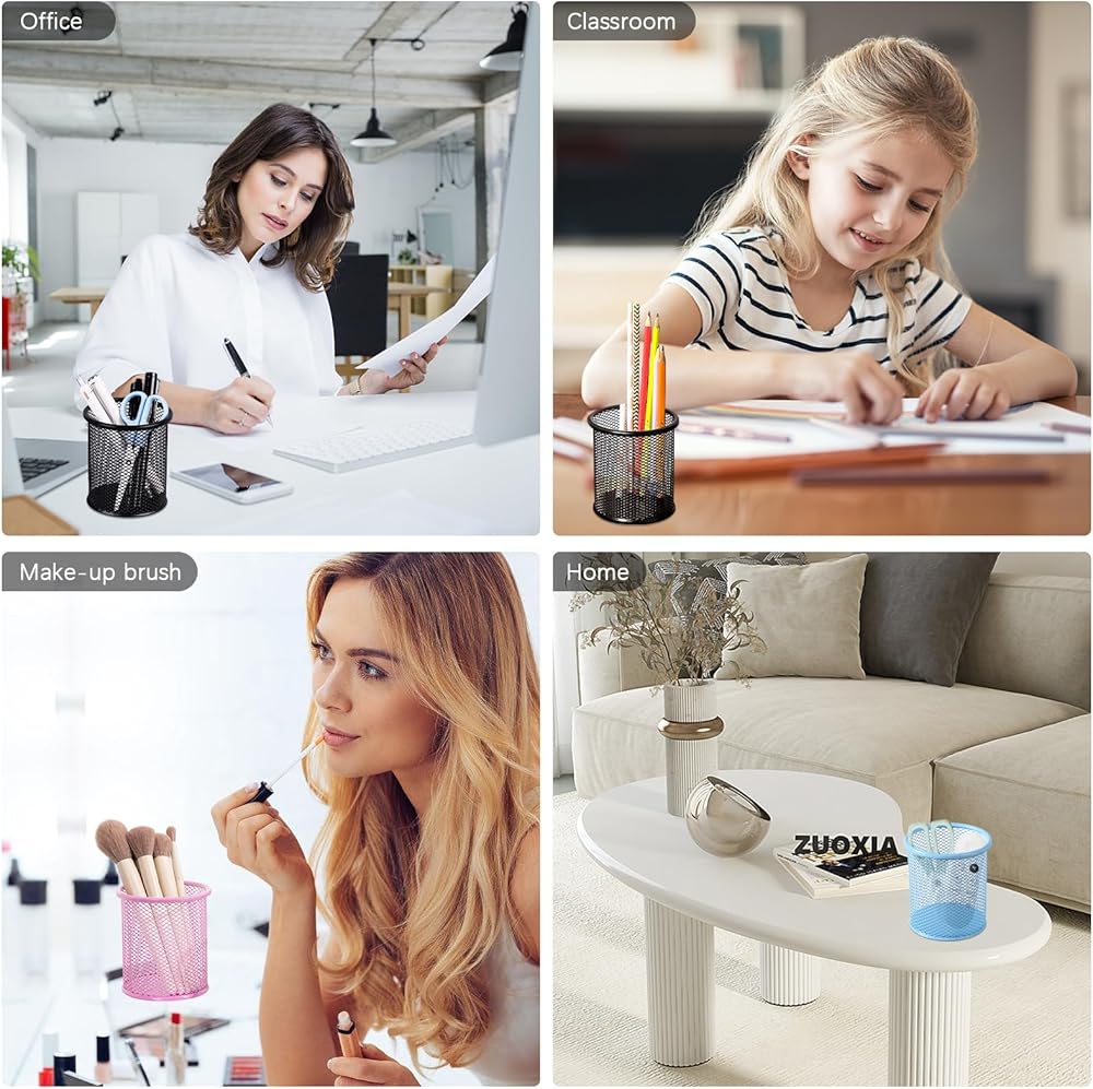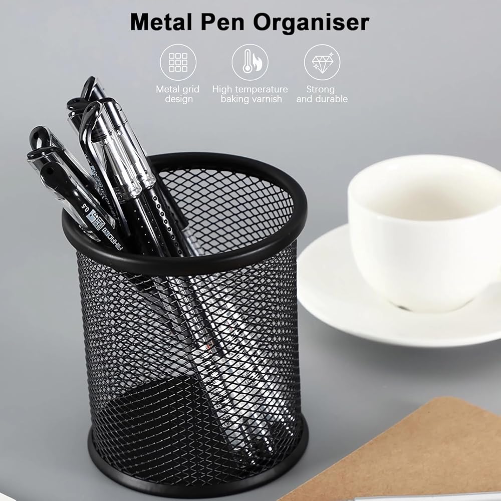 【تصميم شبكي سلكي:】أكواب الأقلام الرصاص مصنوعة من سلك فولاذي، قوية وعريضة بما يكفي لحمل كمية كافية من الأقلام، القاعدة المعدنية ستحمي من أي تسرب، والجزء السفلي الثابت يحافظ على ثبات كوب القلم ولن ينقلب.