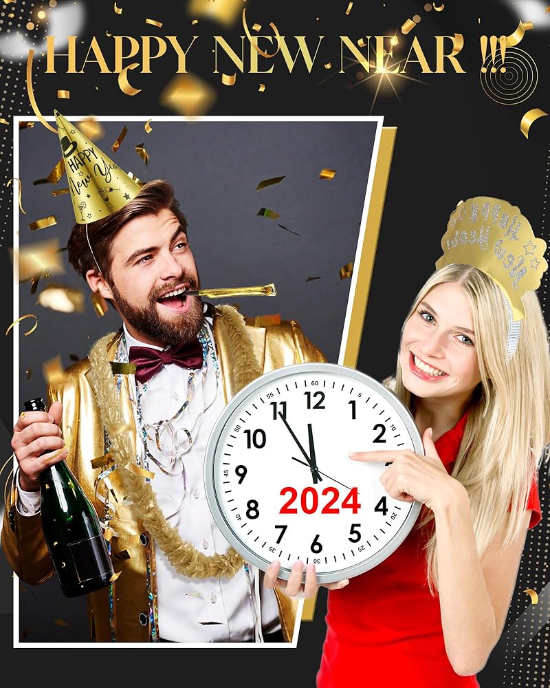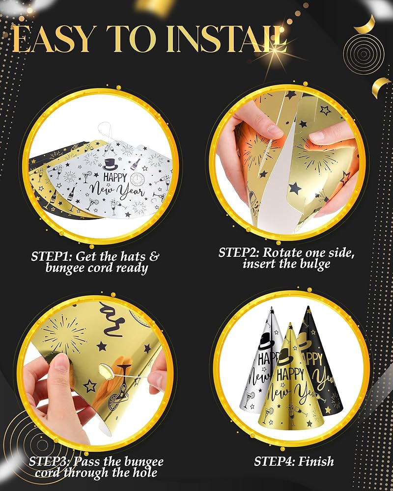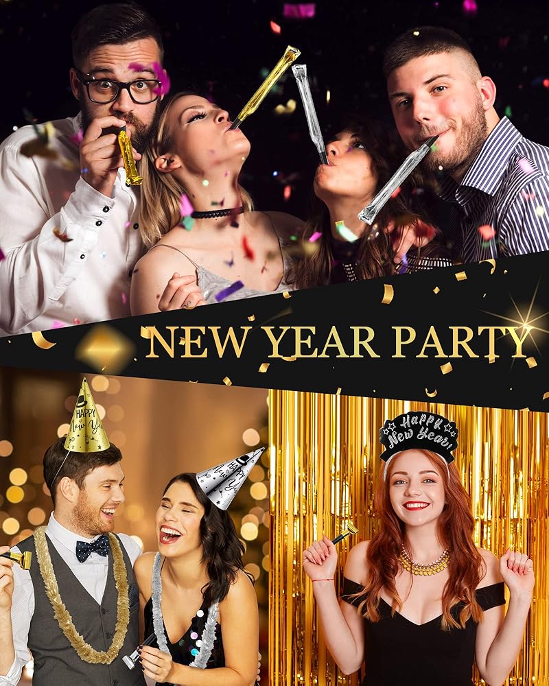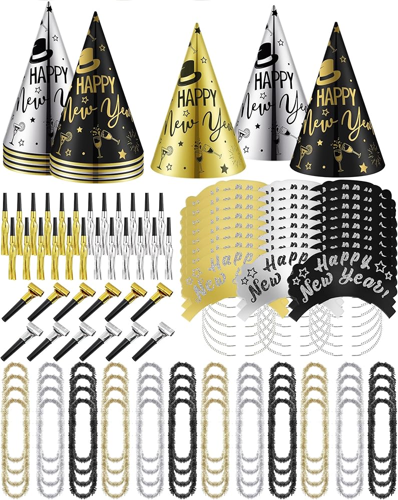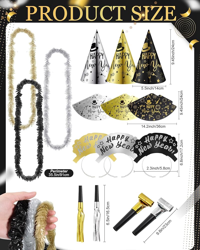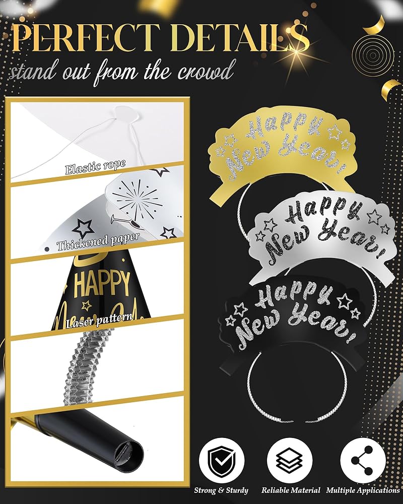 This set features black, gold and silver colors, and you need to accommodate 48 party guests, includes 24 cone hats and 24 tiaras with the phrase [Happy New Year]. Add some shine to your New Year's Eve party by them.