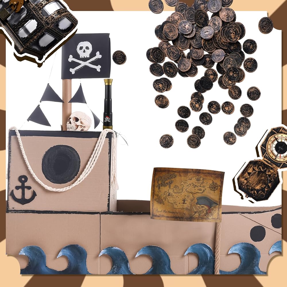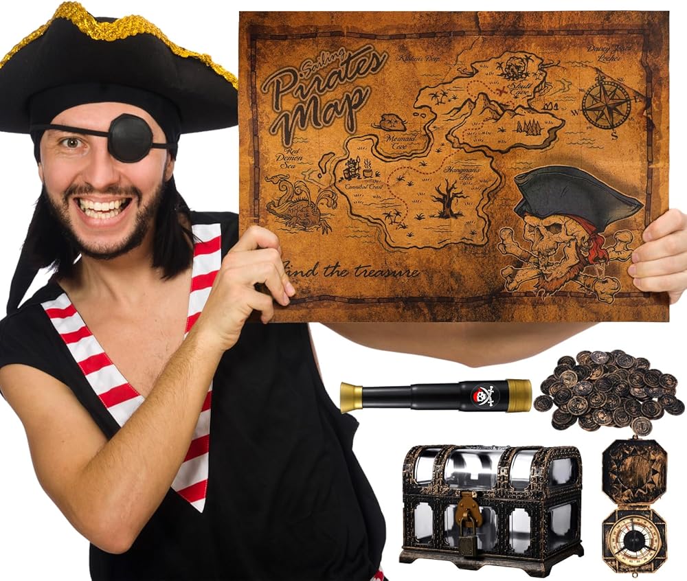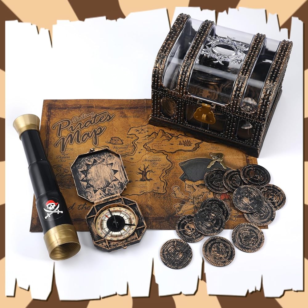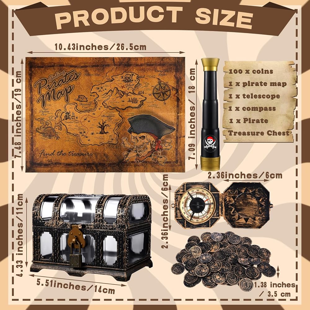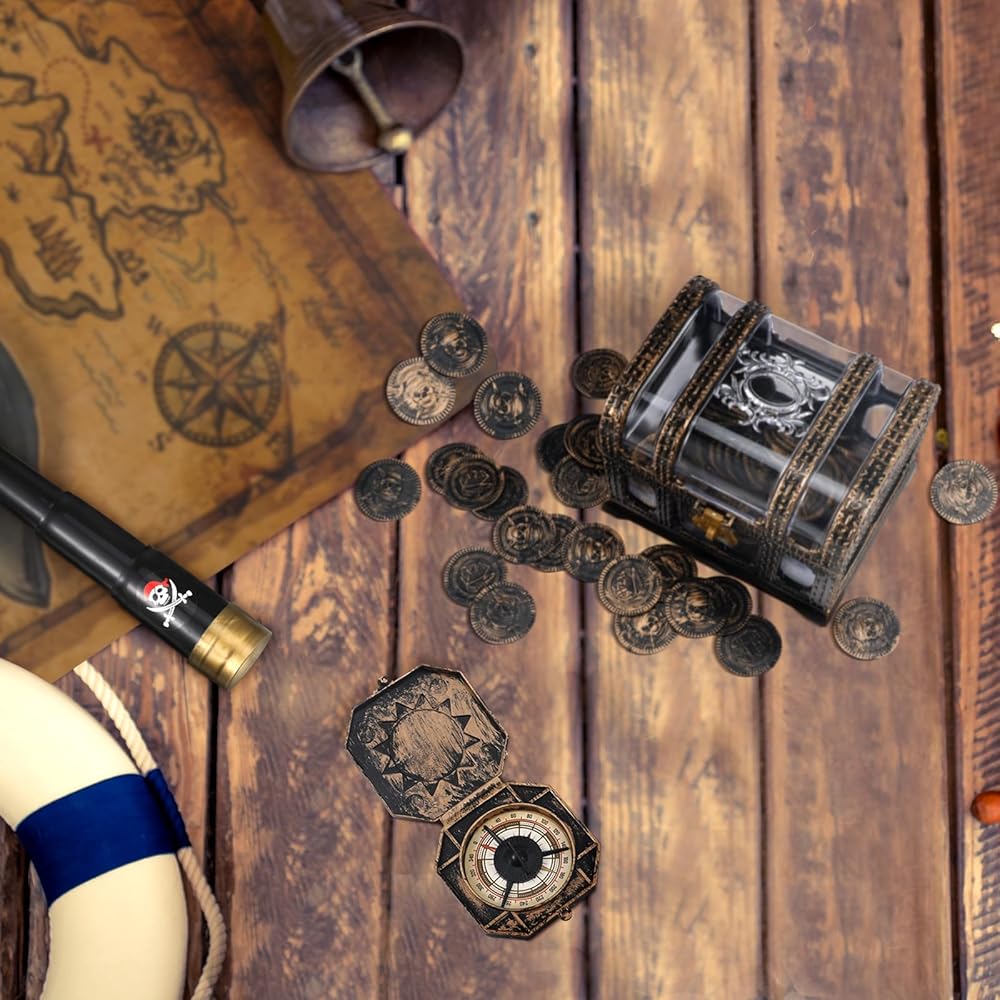 مجموعة قرصان لطيفة: سوف تحصل على 1 × بوصلة بلاستيكية، 1 × خريطة كنز، 1 × تلسكوب تلسكوبي، 1 × صندوق صندوق كنز، و100 قطعة من عملات القرصان، مزيج جميل لتلبية احتياجاتك التنكرية