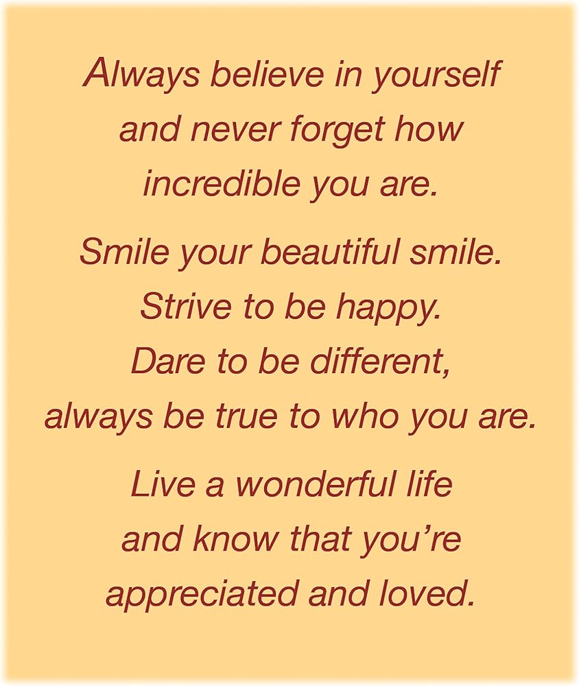 رسالة داخلية - ثق بنفسك دائمًا ولا تنس أبدًا مدى روعتك. ابتسم ابتسامتك الجميلة. نسعى جاهدين لتكون سعيدا. تجرأ على أن تكون مختلفًا، كن دائمًا صادقًا مع من أنت. عش حياة رائعة واعلم أنك موضع تقدير ومحبة.