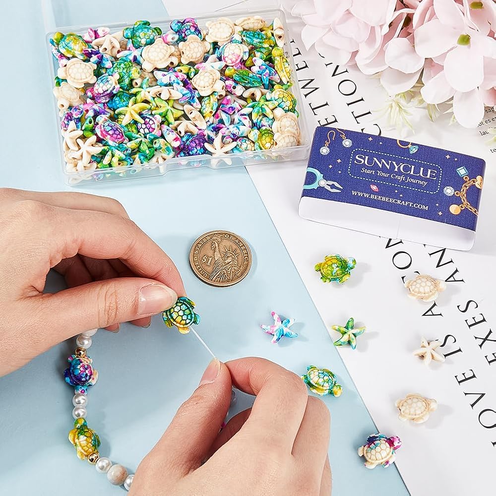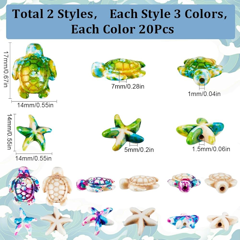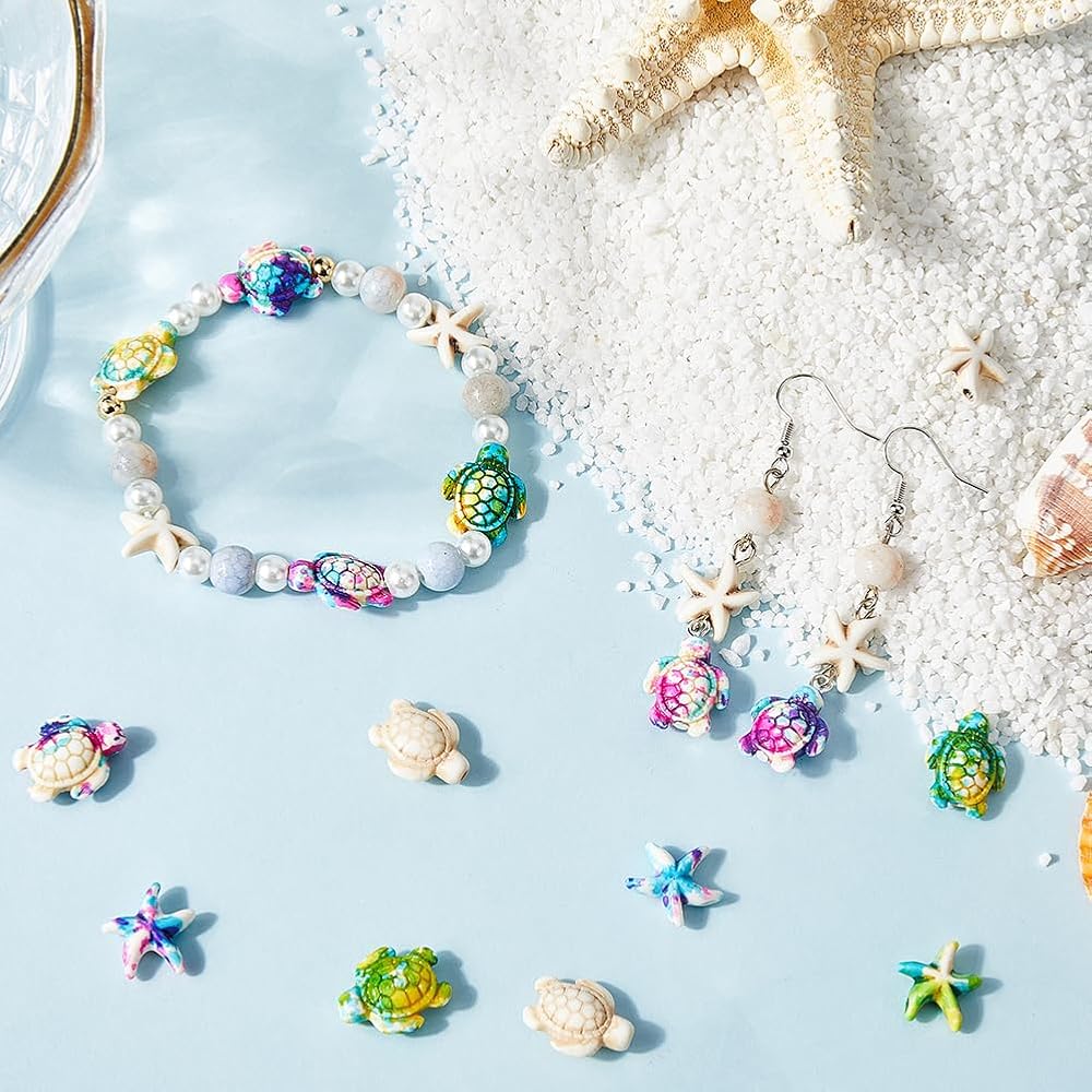SUNNYCLUE 120 قطعة 2 أنماط من خرز السلحفاة الفيروزية نجم البحر خرز صيفي خرز هاواي المحيط الحيوان الحياة البحرية الملونة أحجار كريمة محظوظة خرزة فاصل فضفاضة لصناعة المجوهرات مجموعة خرز السوار الحرفية