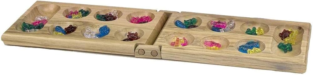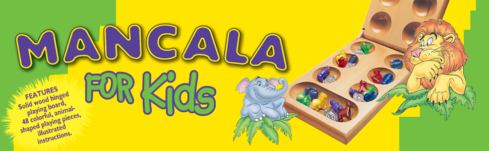 Mancala is thousands of years old, tracing its lineage to ancient Egypt. Legend has it that workers played the game during rest periods while building the pyramids. But the game is great for modern times as well--it has gained new popularity as one of the world's most intriguing and clever two-player games. Our special kids edition replaces gemstones with cute plastic animals. To start, place all the animals in the pockets of the board. When it's your turn, choose a pocket and scoop up all the animals in it, then drop them back into the pockets one-by-one as you circle the board. With just a few easy rules to follow, the object is to collect the most animals by the end of the game. All the pieces go back inside the game unit, which folds up for easy storage. This set includes: 1 high quality wood hinged playing board, 48 colorful animal playing pieces and complete instructions.