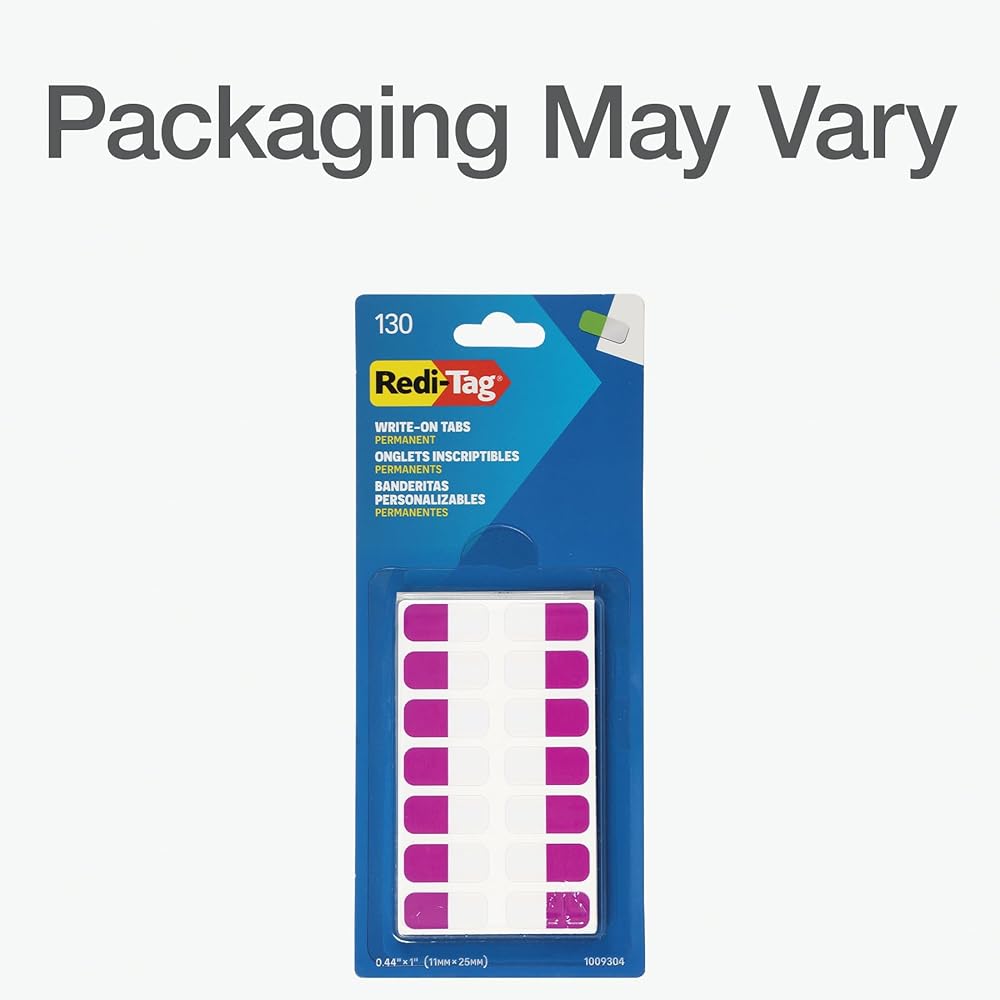 These Redi-Tag Write-On Tabs are perfect for organizing and labeling your work at school, home or office. Index tabs can easily adhere to the edges of pages, files, or folders. Colorful tabs in assorted pastel colors are made to help you quickly identify and categorize your documents, making it easier and quicker to find your information. Write-on tabs have a permanent adhesive and allow you to customize your work, unlike pre-printed index tabs. Use ballpoint pen, pencil or permanent marker to write directly on them. Write-on tabs are always convenient for keeping track of information and reduce the time spent searching for what you need to find. They also work on a variety of surfaces: pages, planners, three-ring binders, books, journals and more. Tab dimensions: 1" x 7/16". 5 assorted pastel colors: pink, purple, blue, teal and green. 130 per pack.