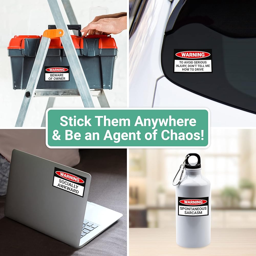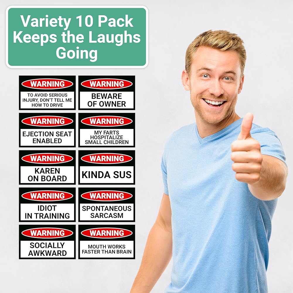 You will receive ten (10) 3 in x 5 in bumper stickers, each with a different funny warning phrase. Our premium quality decals are proudly made in the USA.