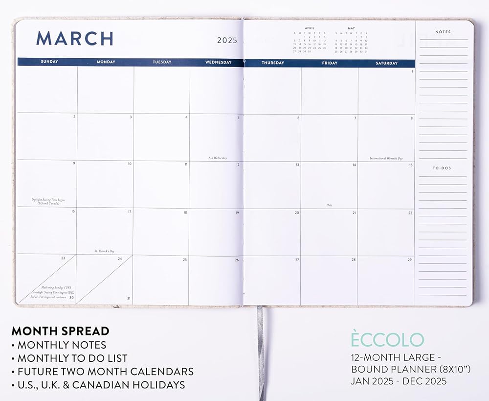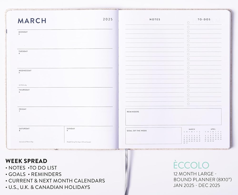 جدول أعمال بغطاء مرن بحجم مكتب إيكولو 2025 - كتاب مواعيد مزدوج العرض، مخطط أسبوعي وشهري، صفحات الملاحظات. المحتوى: 12 فروق تخطيط شهرية، فروق أسبوعية مزدوجة للصفحات. صفحات الملاحظات.