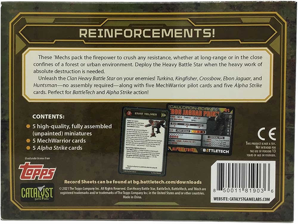 Unleash the power of the BattleTech Clan Heavy Battle Star and dominate the battlefield with this formidable collection of five plastic miniatures, meticulously crafted for the ultimate tabletop gaming experience. Featuring iconic BattleMechs including the Turkina, Kingfisher, Crossbow, Ebon Jaguar, and Huntsman, this pack brings the heart-pounding action of Mech warfare right to your tabletop. Each miniature boasts unparalleled detail, capturing the essence of these classic BattleMechs in a modern and highly-detailed style. Whether you're a seasoned BattleTech veteran or new to the game, these miniatures are sure to impress with their quality craftsmanship and stunning design. With no assembly required, you can dive straight into the action. These miniatures come fully assembled and ready for painting, allowing you to customize your fleet to your liking. Additionally, each miniature comes with its own MechWarrior pilot card and Alpha Strike card, providing you with everything you need to wage war using your preferred rule set. The BattleTech Clan Heavy Battle Star is not just a collection of miniatures; it's a gateway to endless hours of thrilling gameplay. Compatible with both the classic BattleTech tabletop game and Alpha Strike, these miniatures offer versatility and excitement for players of all skill levels. Immerse yourself in the rich universe of BattleTech, a science-fiction "space opera" where humanity has spread to the stars and titanic interstellar empires clash for dominance. Experience the excitement of dice rolling, hexagon grid-based combat, and immersive role-playing as you command your MechWarriors to victory. This pack is the perfect companion to Technical Readout: Clan Invasion, providing detailed information on these devastating OmniMechs and further expanding your knowledge of the BattleTech universe. Whether you're looking to expand your collection or dive headfirst into the world of BattleTech, the Clan Heavy Battle Star has everything you need for an unforgettable gaming experience. Gather your friends and family for game night and prepare for epic battles that will test your strategic prowess and tactical skills. With the BattleTech Clan Heavy Battle Star at your command, victory is within your grasp. Join the fight and become a legend in the annals of Mech warfare.