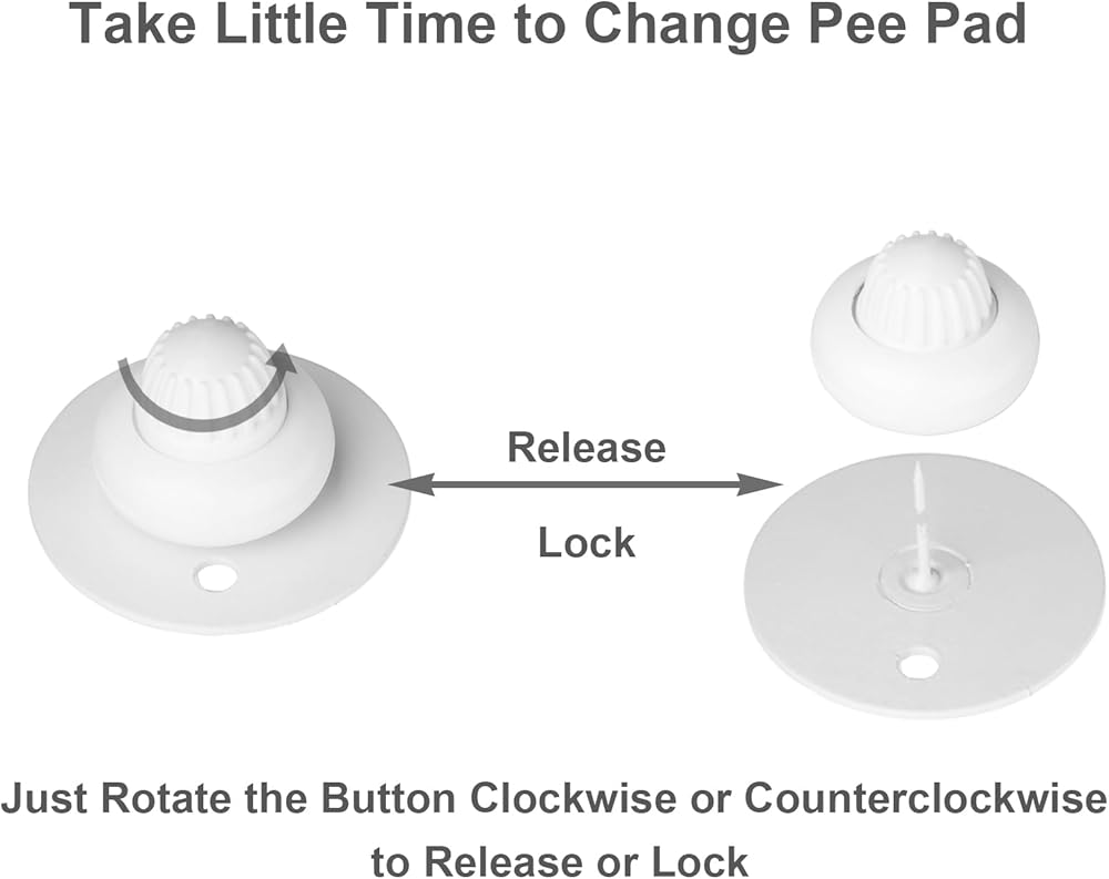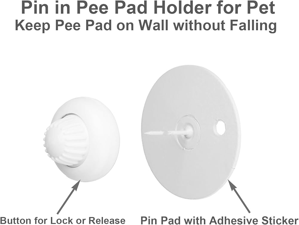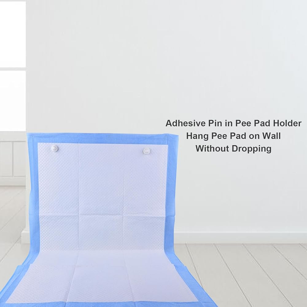 Pin in Design: The pee pad holder includes 1 pin and 1 plastic lock; Pin the pee pad on wall, and then rotate the lock to fix or release. Once the pee pad fixes on wall, will not drop.