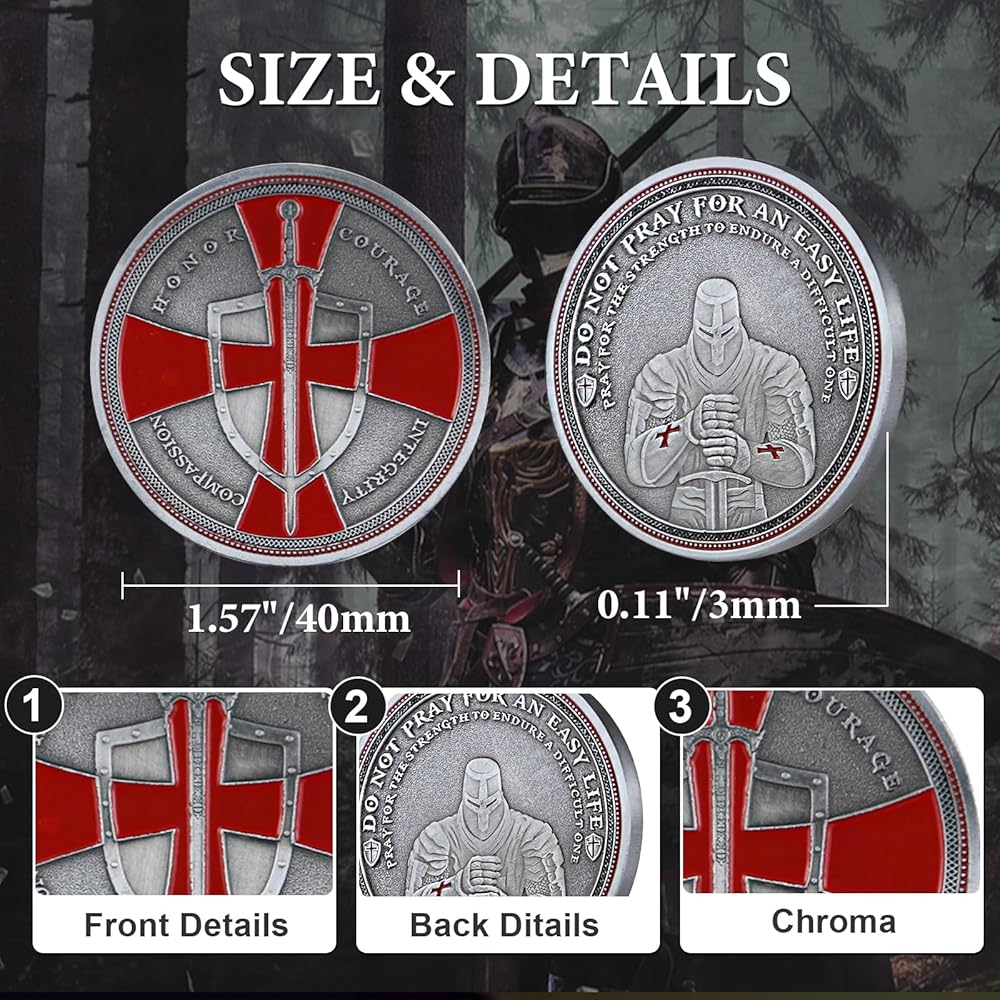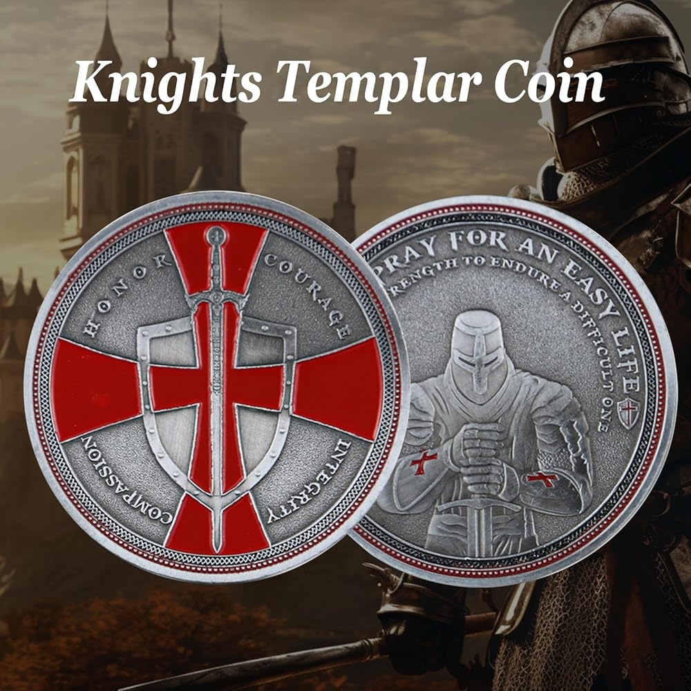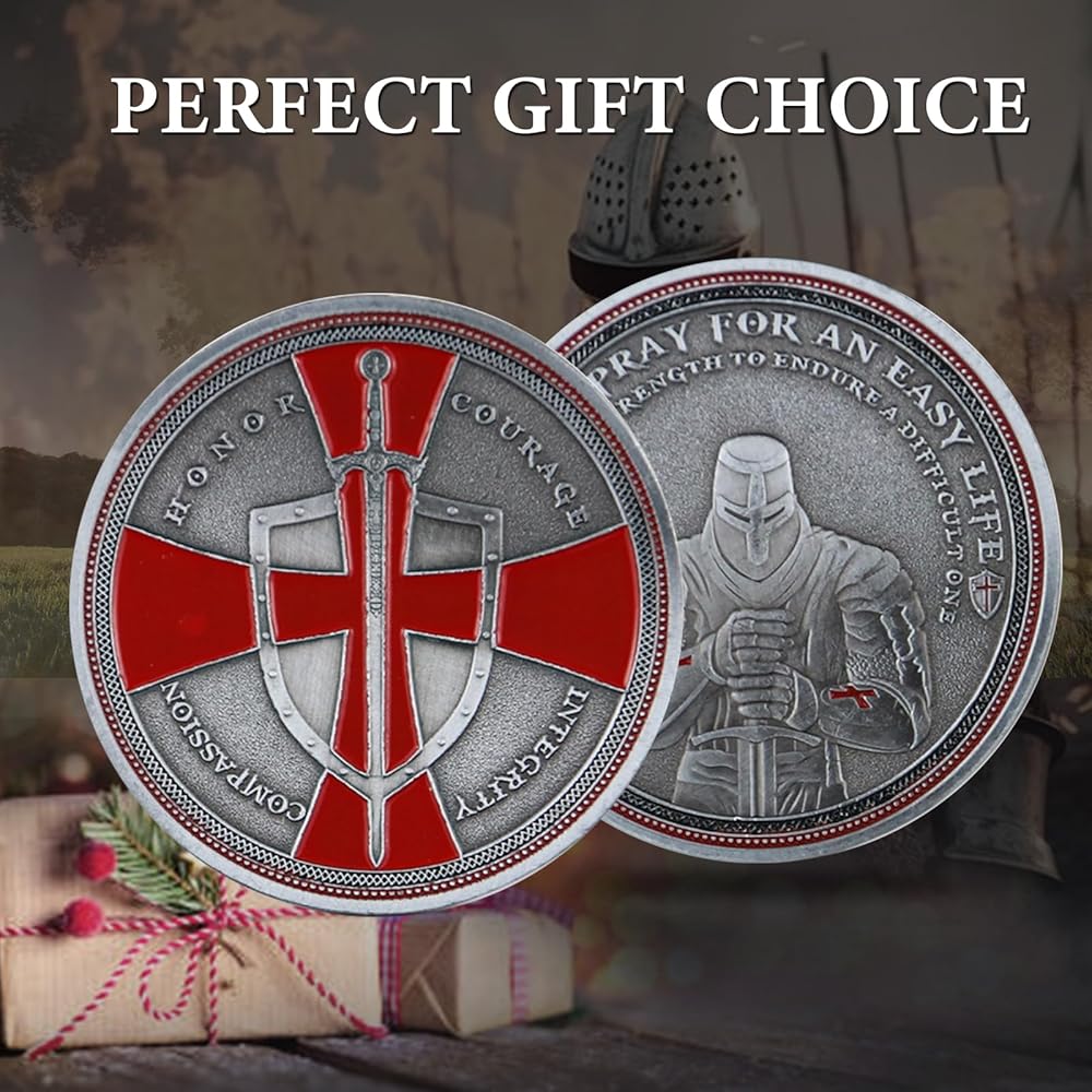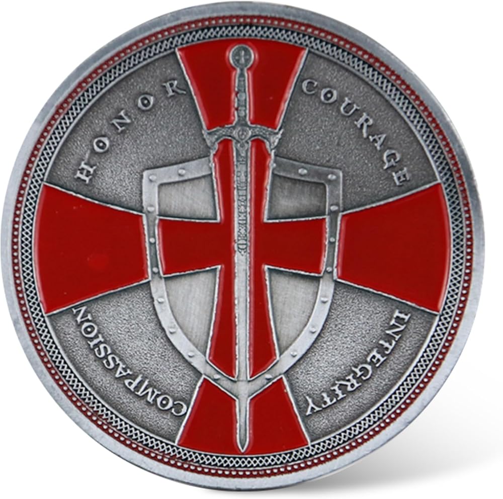 • عملة تحدي مسيحية فريدة من نوعها من Knight Templar مع صليب أحمر ورموز درع