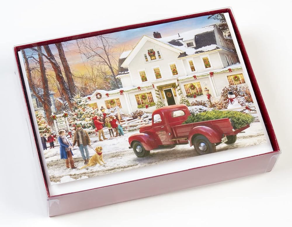 Box of 15 Christmas cards and 16 deluxe gold foil lined envelopes. Cards measure 4 1/2"x6 1/4" when folded. All of our Christmas cards are proudly printed in the U.S.A. on durable card stock and neatly packaged in an attractive red box. The artist for this card is Greg Giordano. Inside greeting: Wishing you a good old-fashioned Merry Christmas and a Happy New Year!